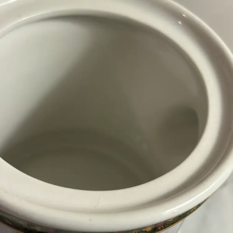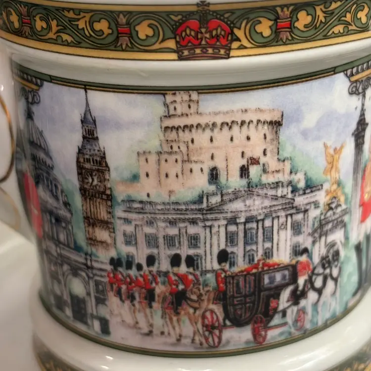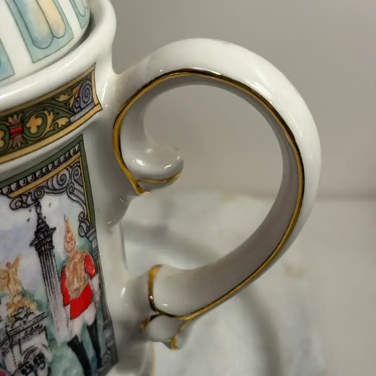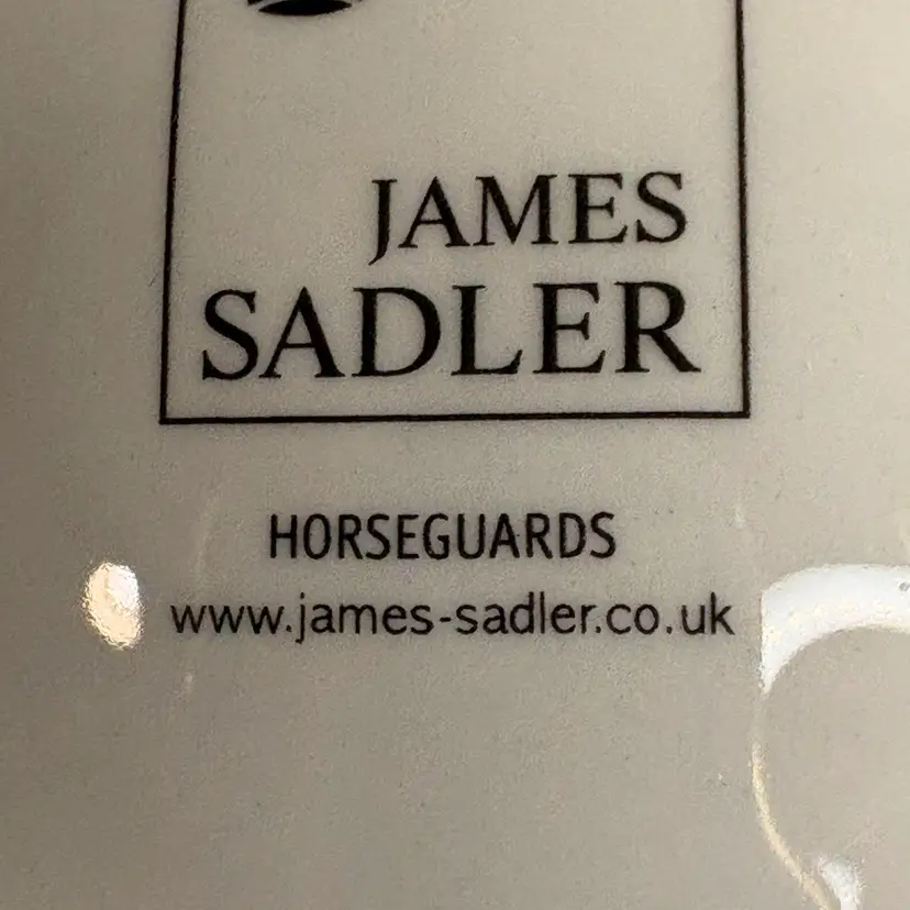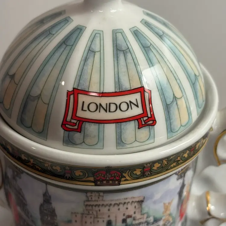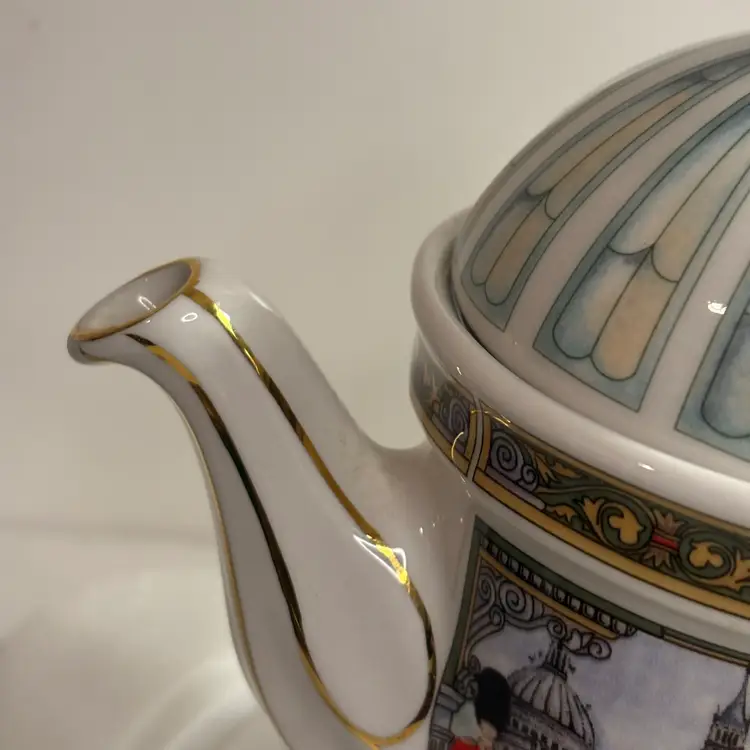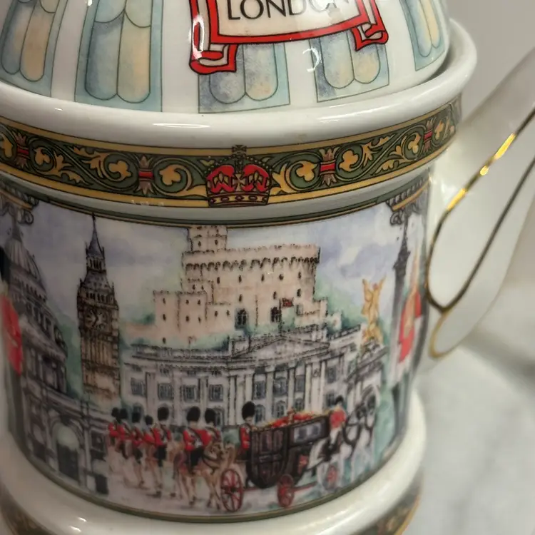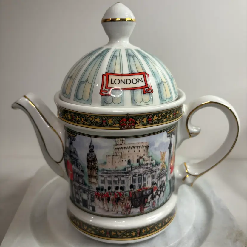 The James Sadler "Horseguards" Teapot with Lid is a vintage porcelain tea pot made in England. This multicolor teapot features a round shape, gold trim, and a glossy finish, adding a touch of British charm to your tea service. With the brand name Sadler printed on the backstamp, this teapot is a unique and stylish addition to any collection of decorative cookware. Perfect for vintage tea enthusiasts, this teapot is sure to add a touch of elegance to your tea time.