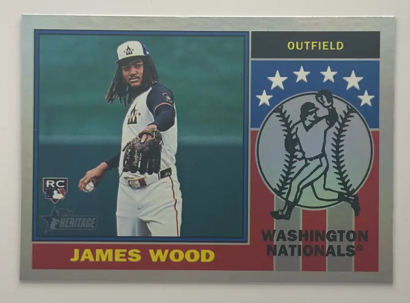 Snag this James Wood rookie card from Topps Heritage, showcasing his talent in the outfield for the Washington Nationals.
