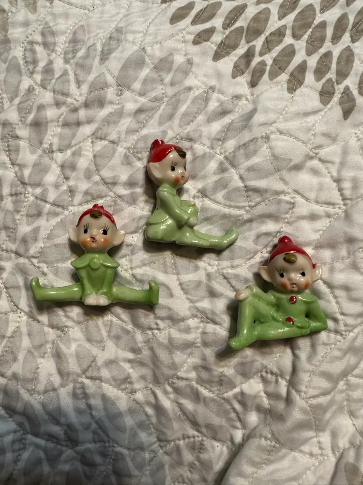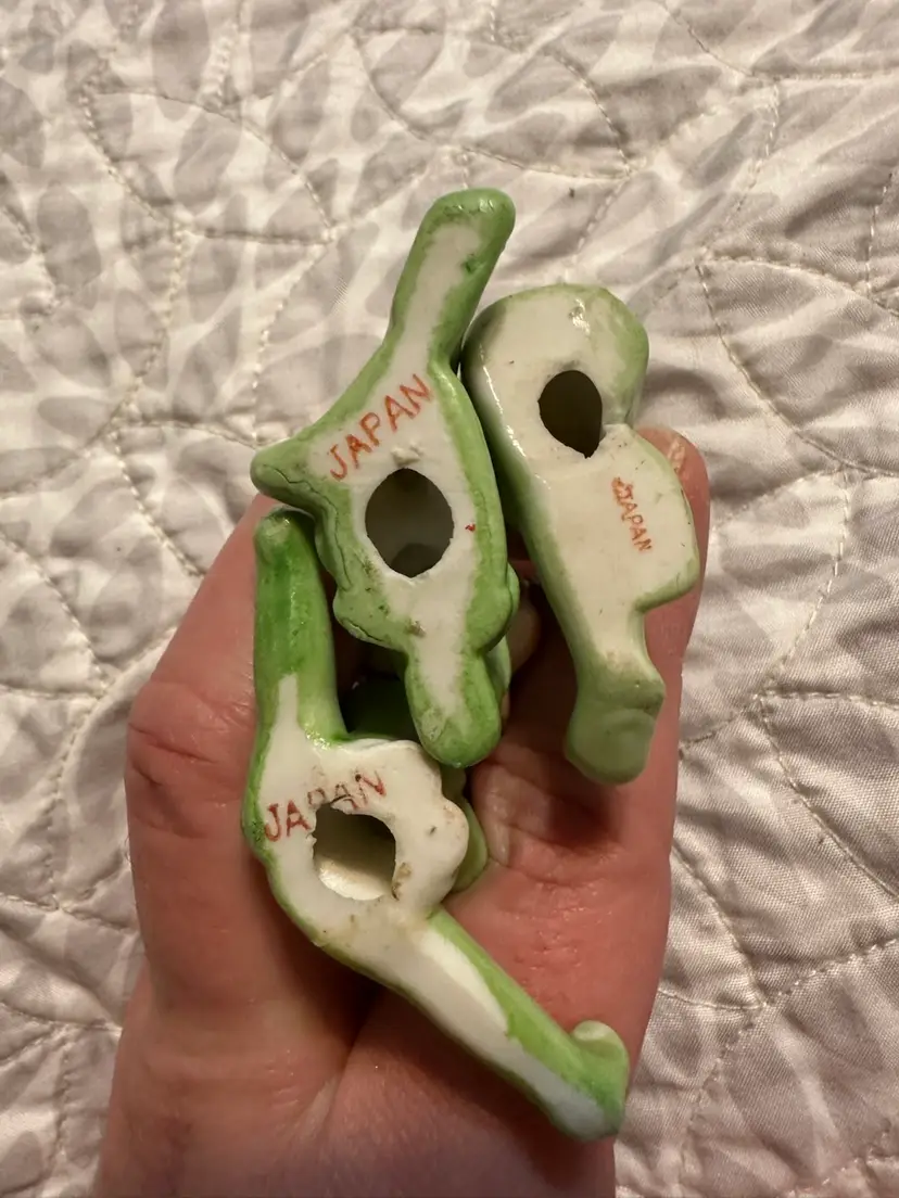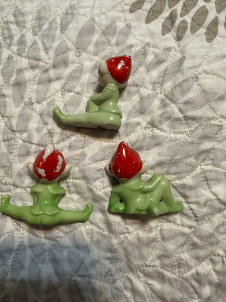 So cute. There is wear to the red cold paint which is common. Other than that, I note no damage. All three are marked Japan on their bottoms in red. 2 “ to 2.25 “ tall by 1.75” to 2.5” across,