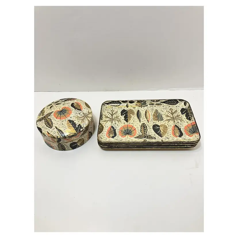 Beautiful coaster and Tray made in Japan. Perfect condition! Kosher measure four and three-quarter inches in circumference the round box measures 5 inches in circumference. Trays measure 8 1/2 x 5 1/2. Weighs 2lbs