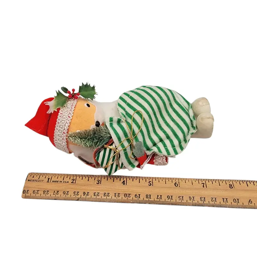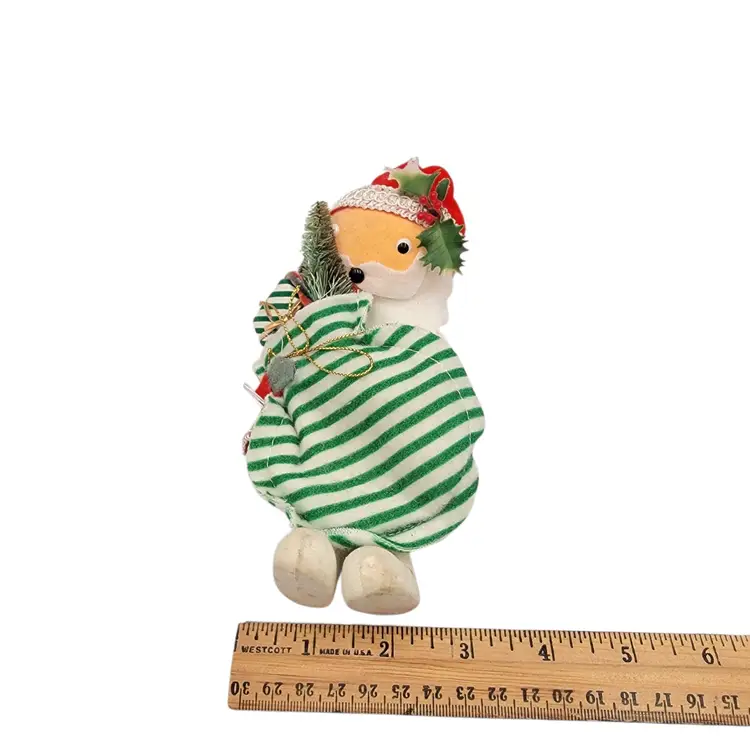 This charming Santa figurine, crafted in Japan, tells tales of holiday cheer. Sporting a festive red ensemble, he carries a green-striped sack overflowing with gifts.