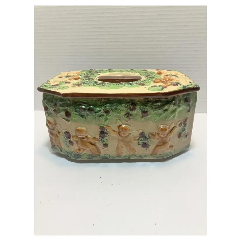 This in excellent condition vintage Japan cookie jar has a children/cherub? Pattern. 8 1/4 inches long by 4 inches deep and 6 inches wide. This weighs 2 1/2 pounds by itself.
