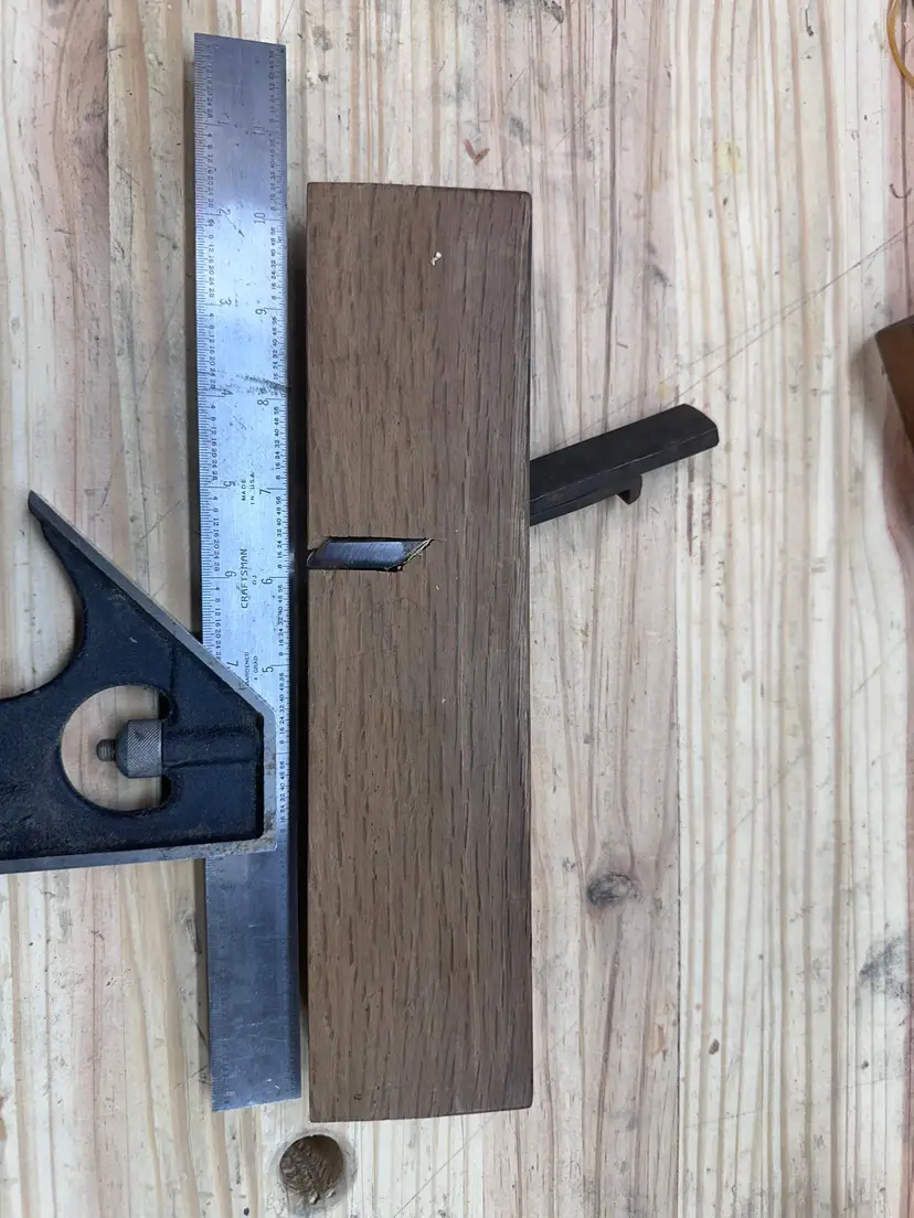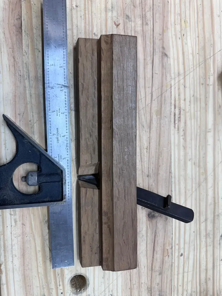 The blade is traditional style dual layer forge welded steel, with the relatively thin brittle/hard layer set as the cutting edge for longer wear before a resharpening and the relatively softer and thicker steel of the main body welded to provide the toughness a plane blade would need to avoid breakage. The chip breaker is single layer sharpened steel, wedged into place to hold the main cutting blade to the proper setting position.