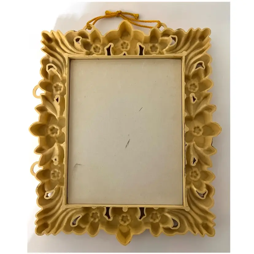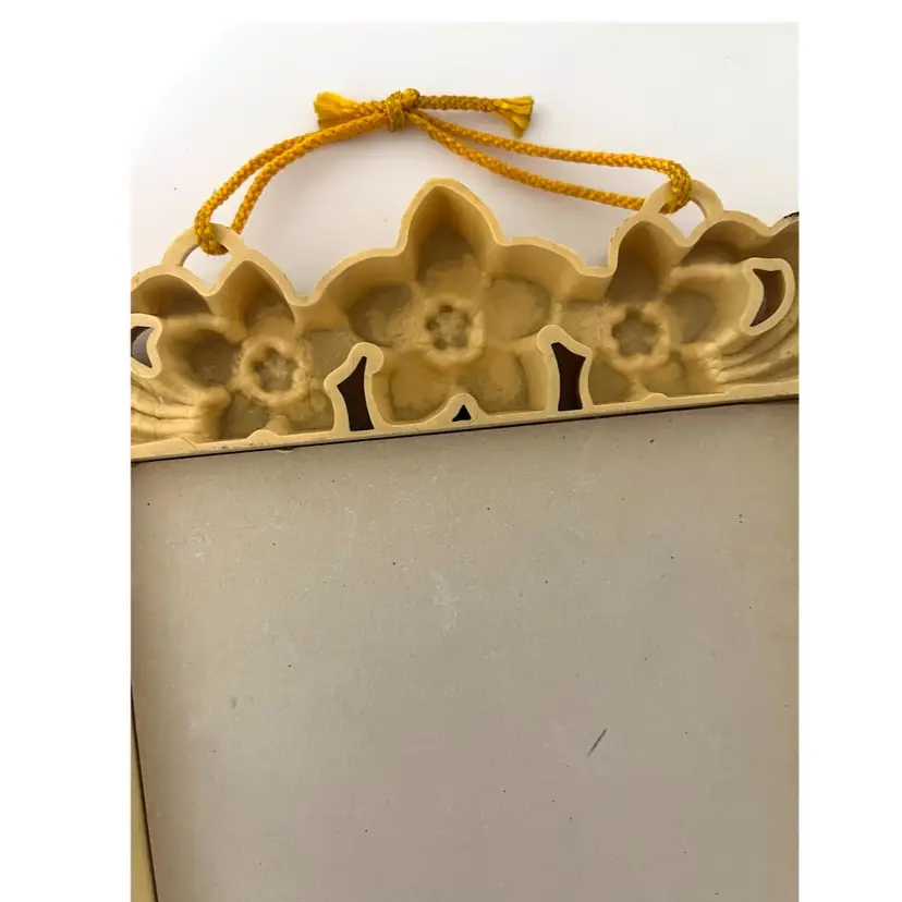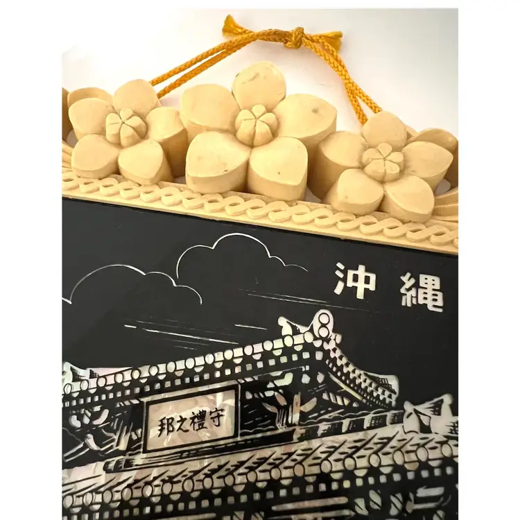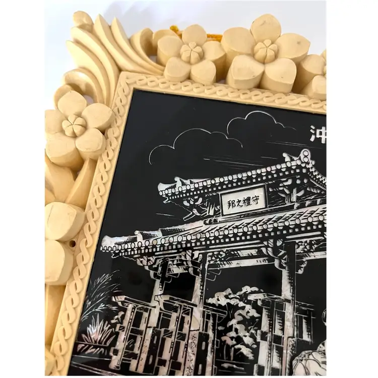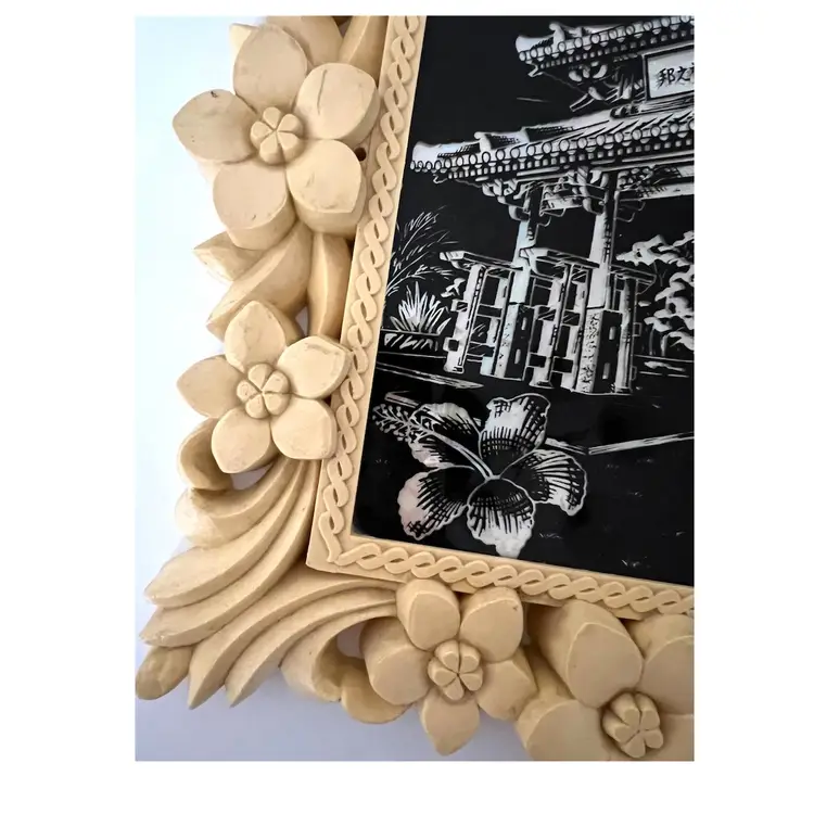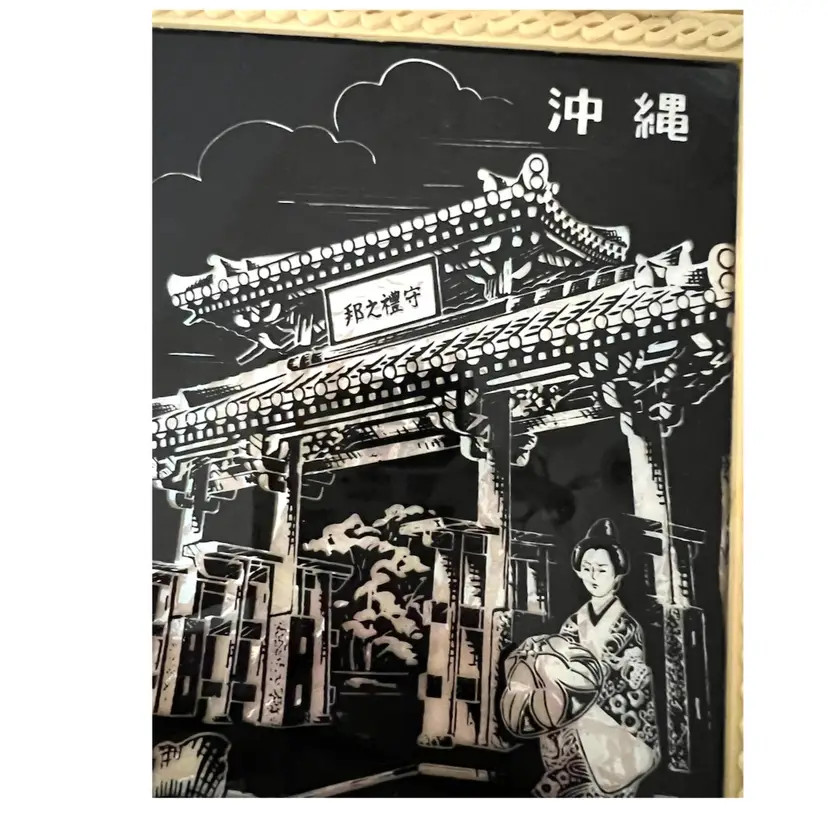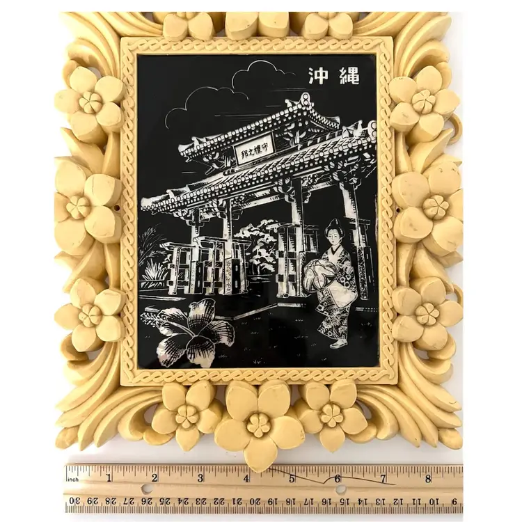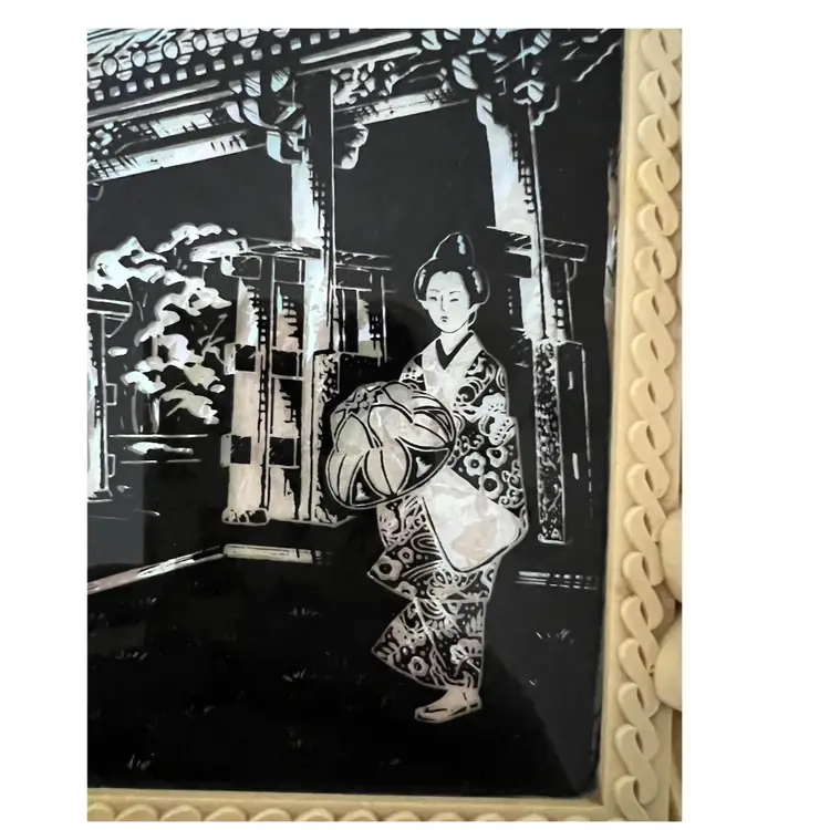 Japanese Floral Plastic Frame Art Wall Decor Okinawa Abalone Mother Of Pearl Inlay Geisha Girl with Umbrella. 10x8.5 in. Signs of wear on the frame flowers (SEE PHOTOS)