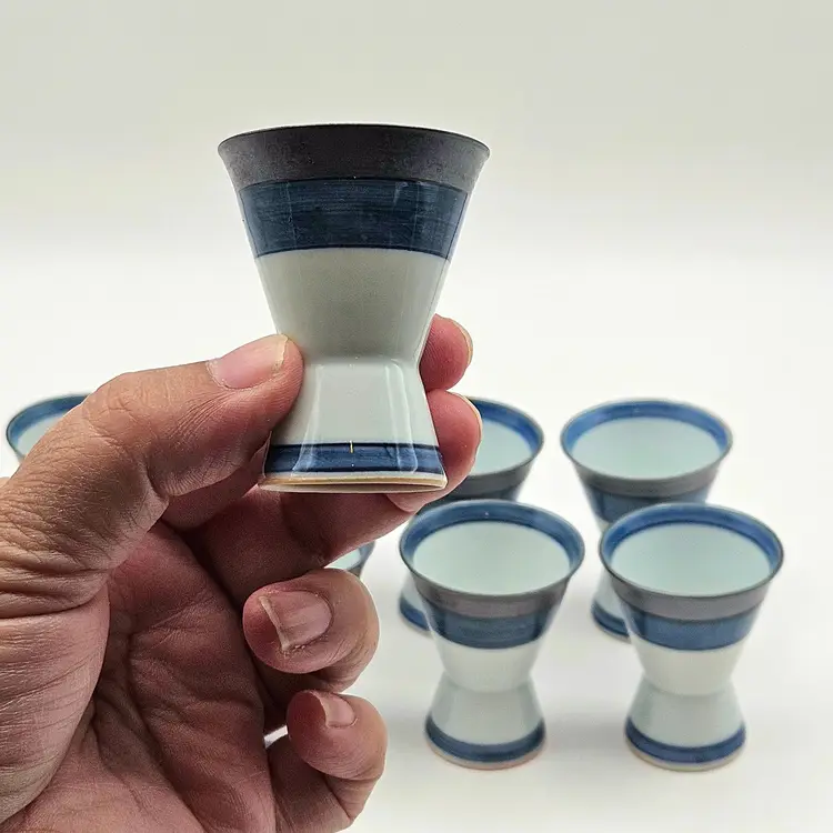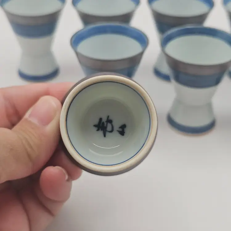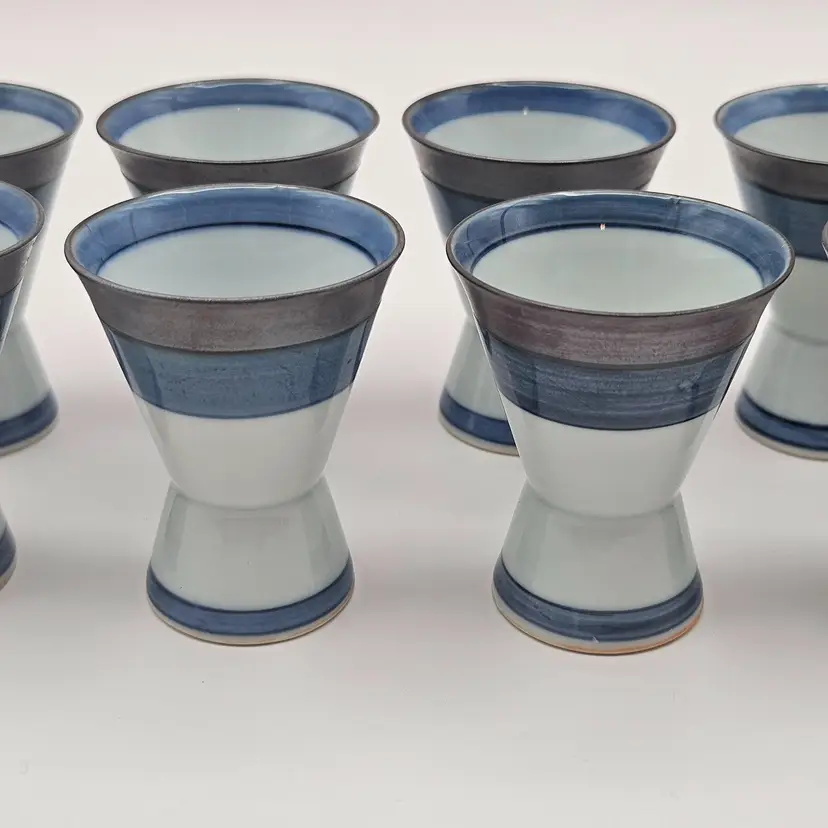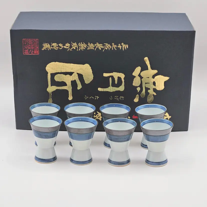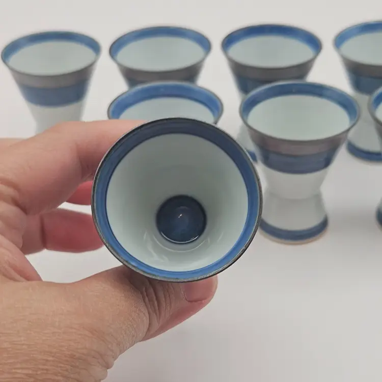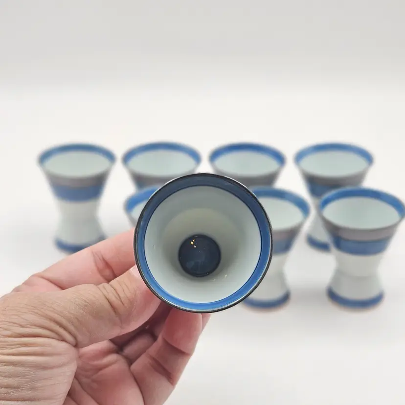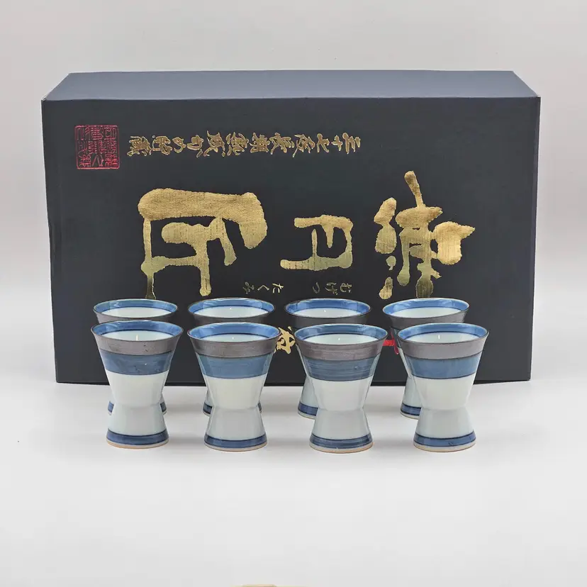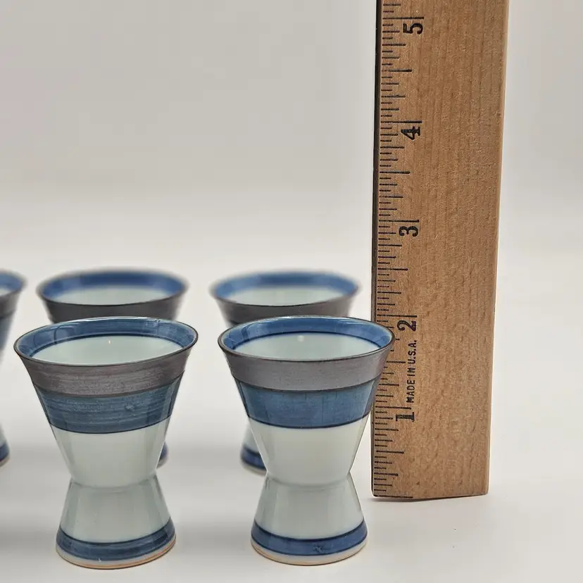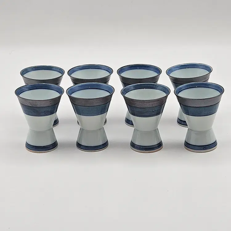 Japanese Hand Decorated Blue Silver White Sake Cups Set of 8 with Box