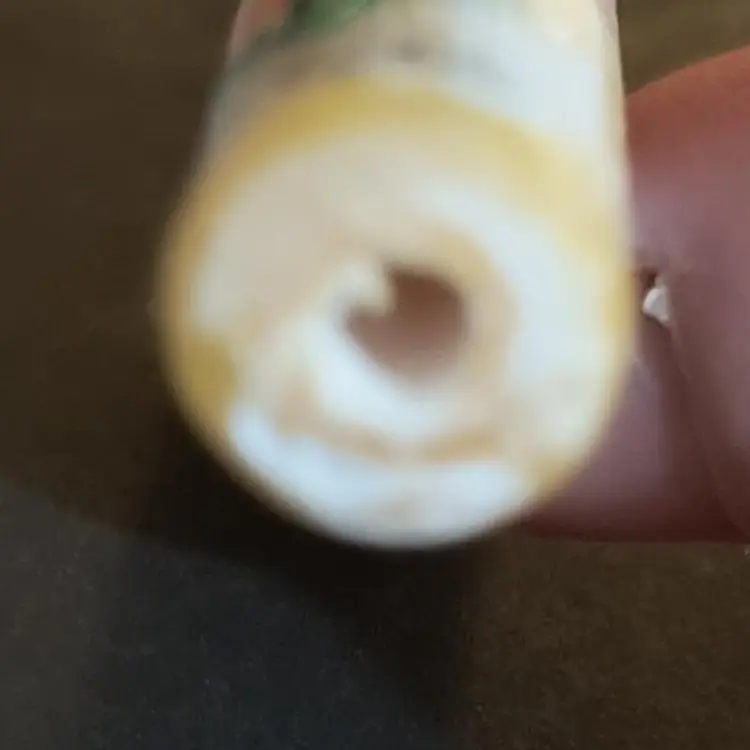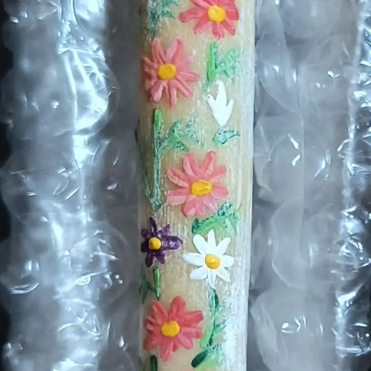 This handmade candle measures 4.5 inches long. From my research is appears to be a Japanese hand painted candle. It is signed near the bottom. There is a hole on the bottom to be put on a stand. It is a pretty display piece that comes in it's original box for safe storing.