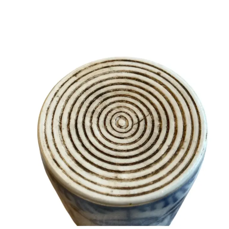 2.5” x 1.5” ceramic cup. Could be used as a tooth pick holder. Blue and white. No cracks or chips.