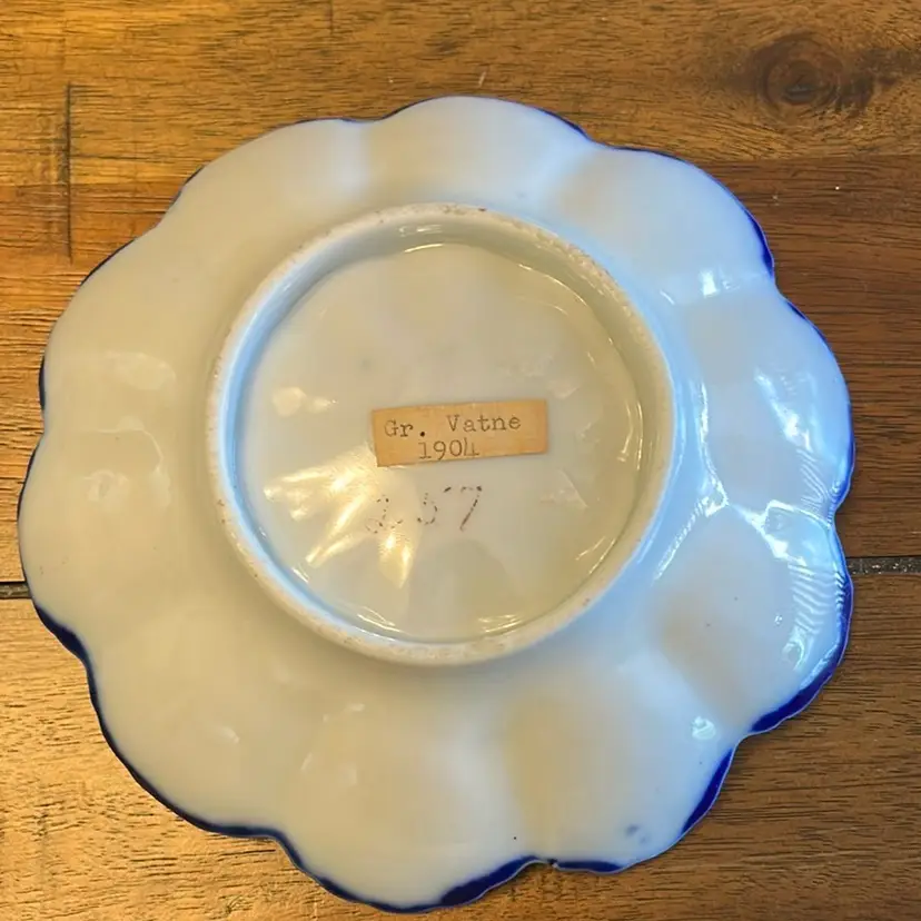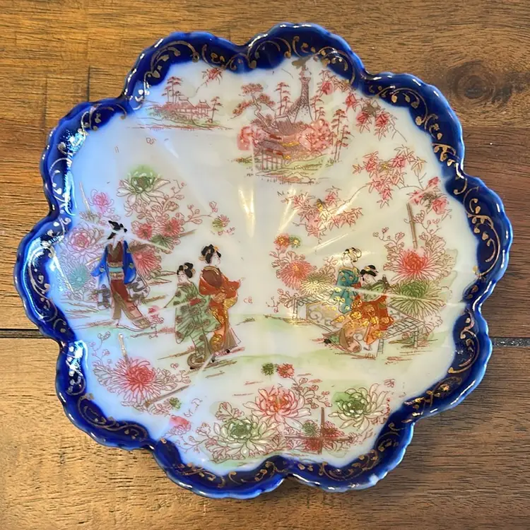 This Geisha Japanese bowl has a blue rim. There is wear on the edges within the bowl, see pictures. It is about 6 inches wide.