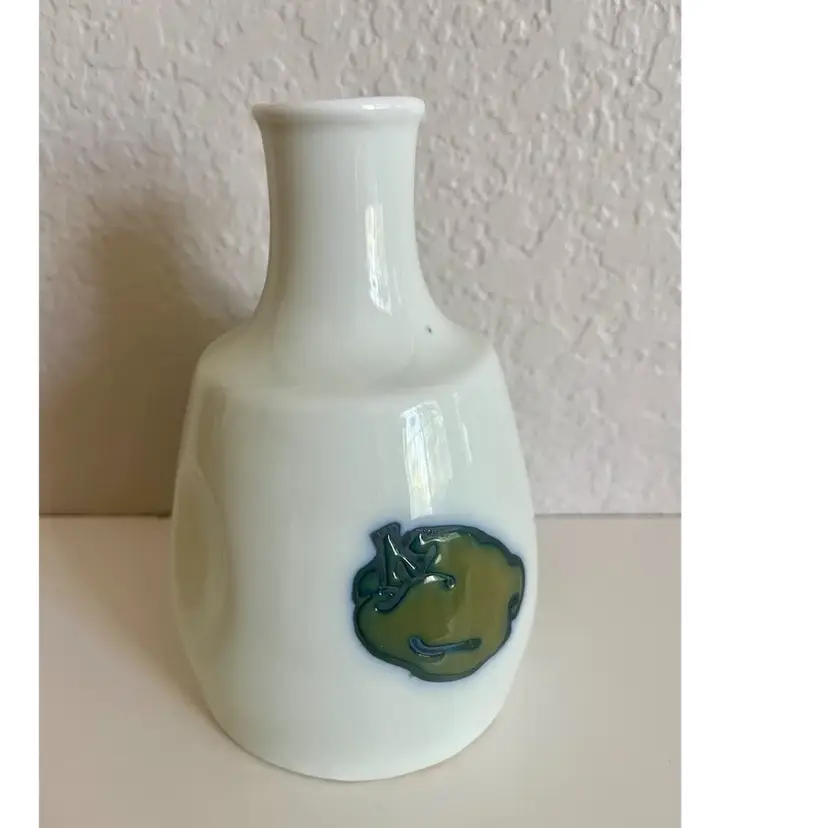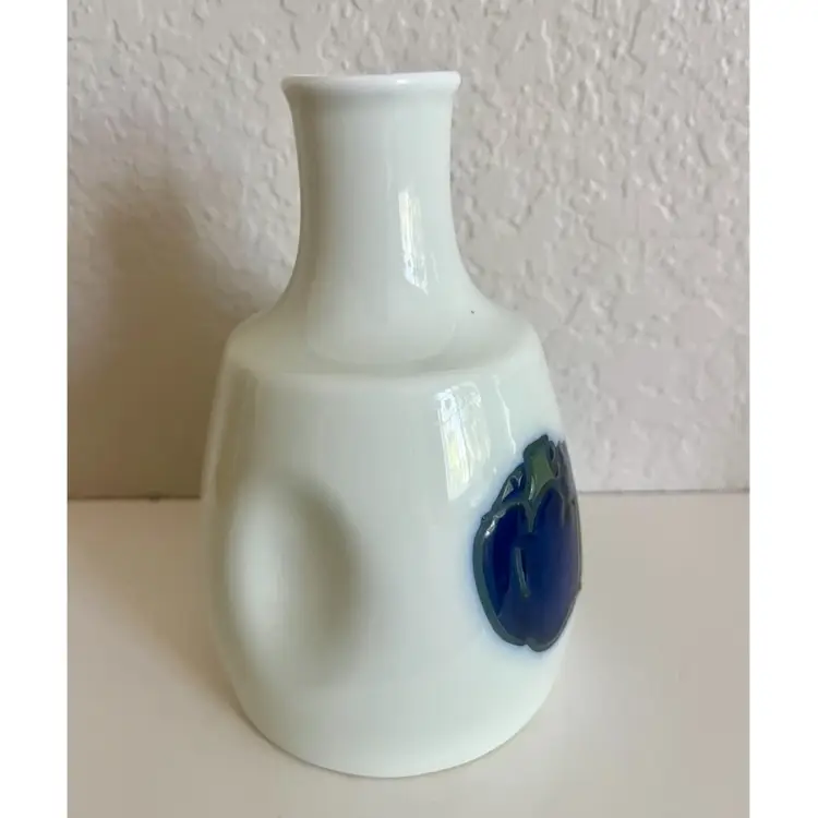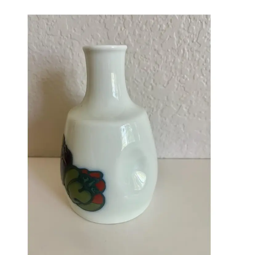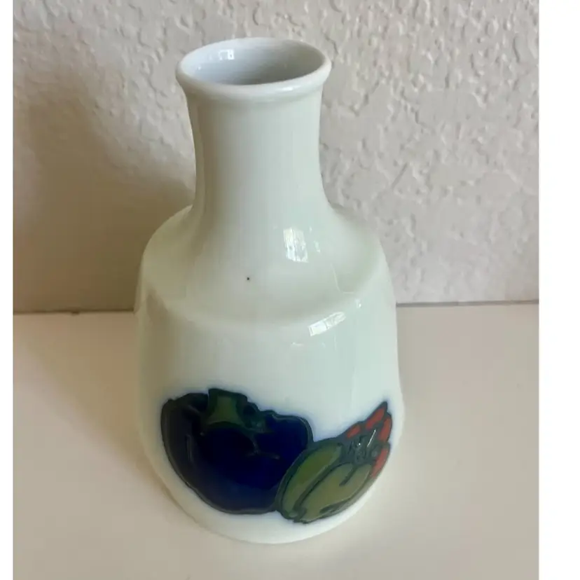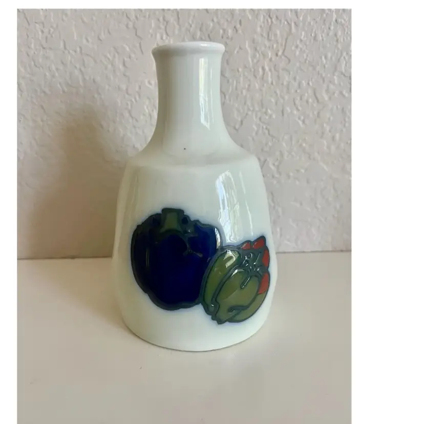 This vintage Japanese decorative ceramic vase would be a kitschy addition to you kitchen. It features raised bell peppers on its side, one purple and the others green and red.