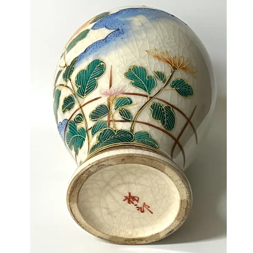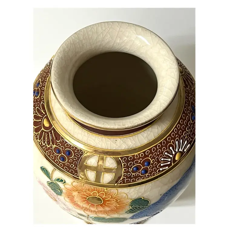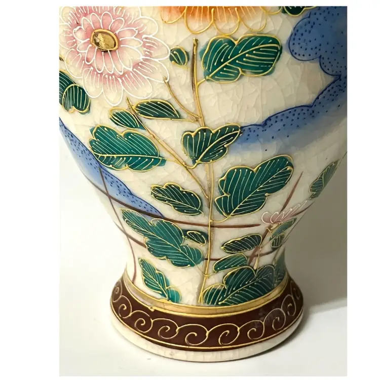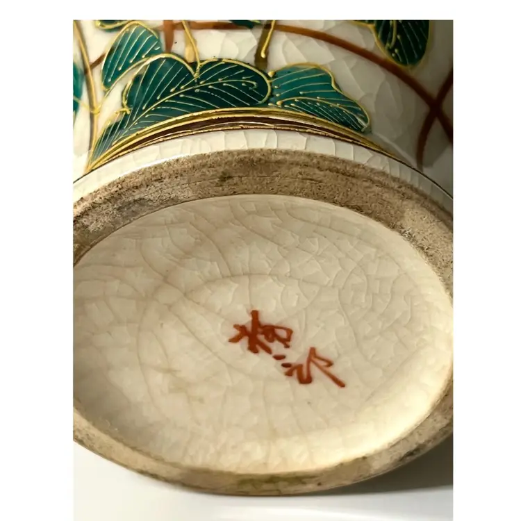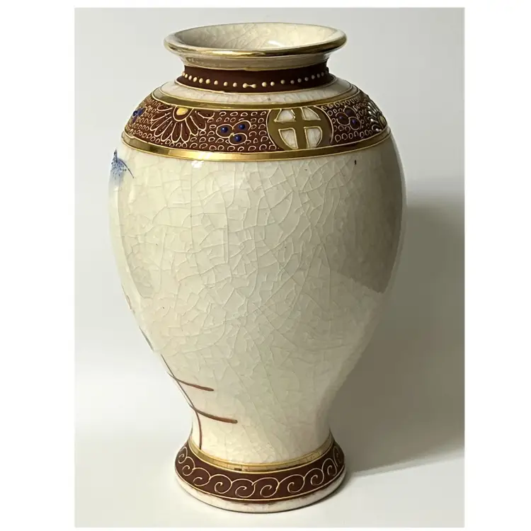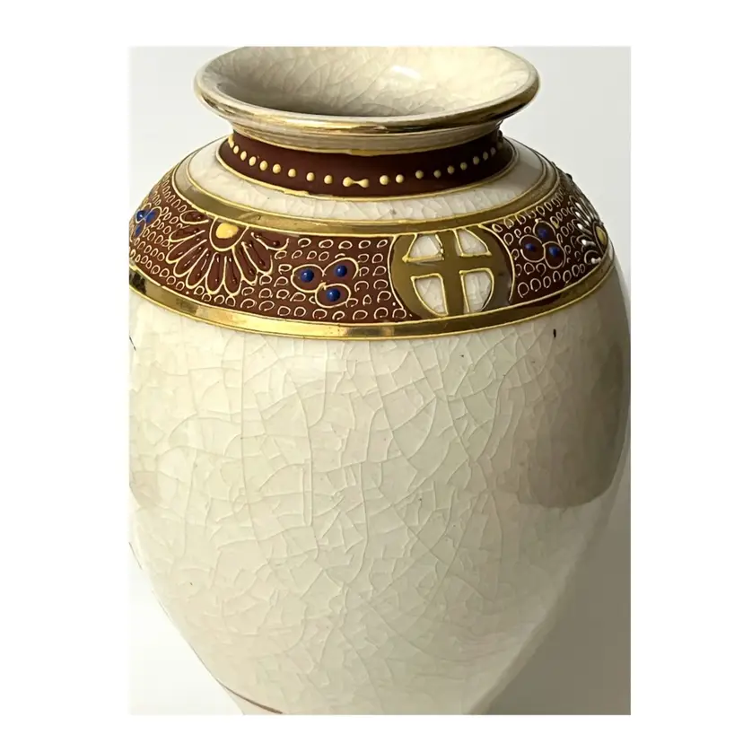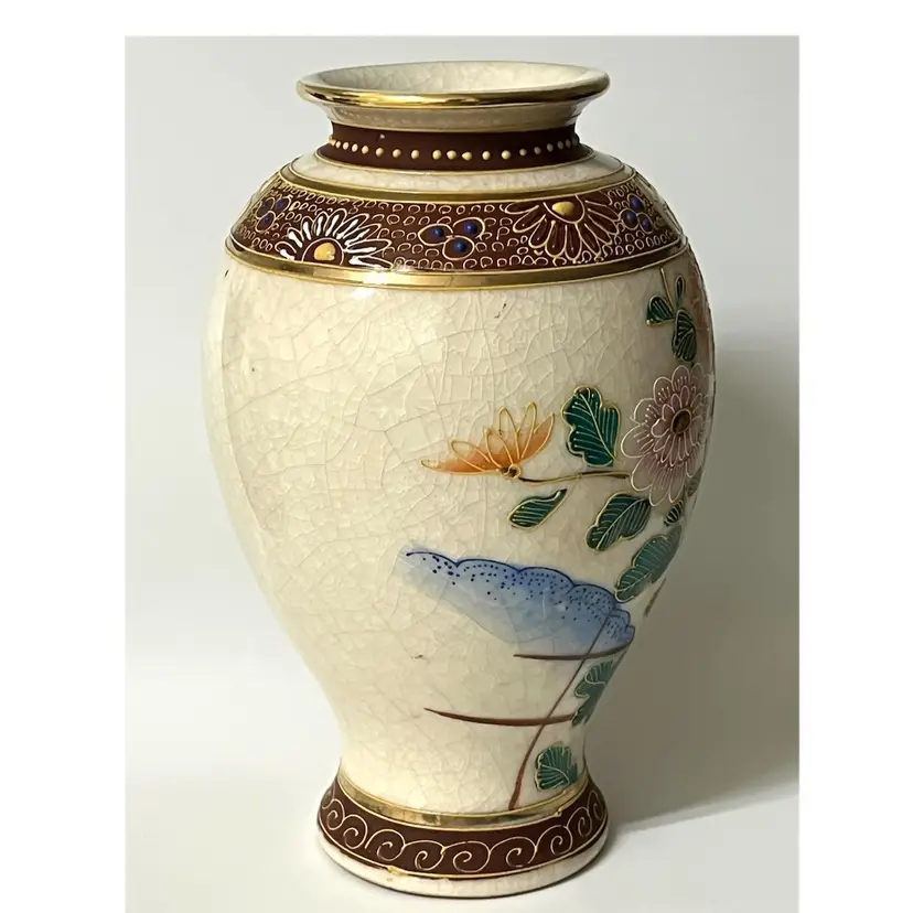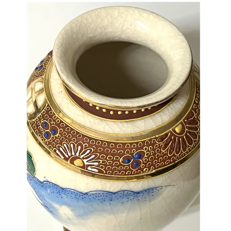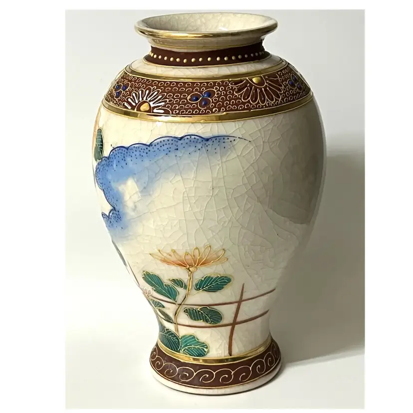Japanese Satsuma Ceramic Flower Vase by Kusube Sennosuke Hand Painted with Gold Accents. 8.5 in height, 5 in width, 3 in top diameter.