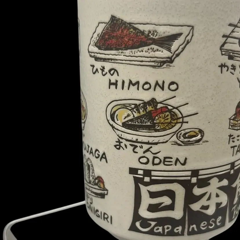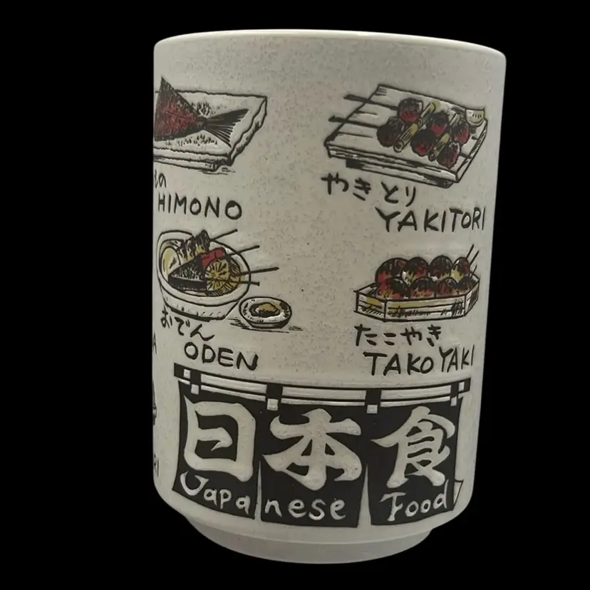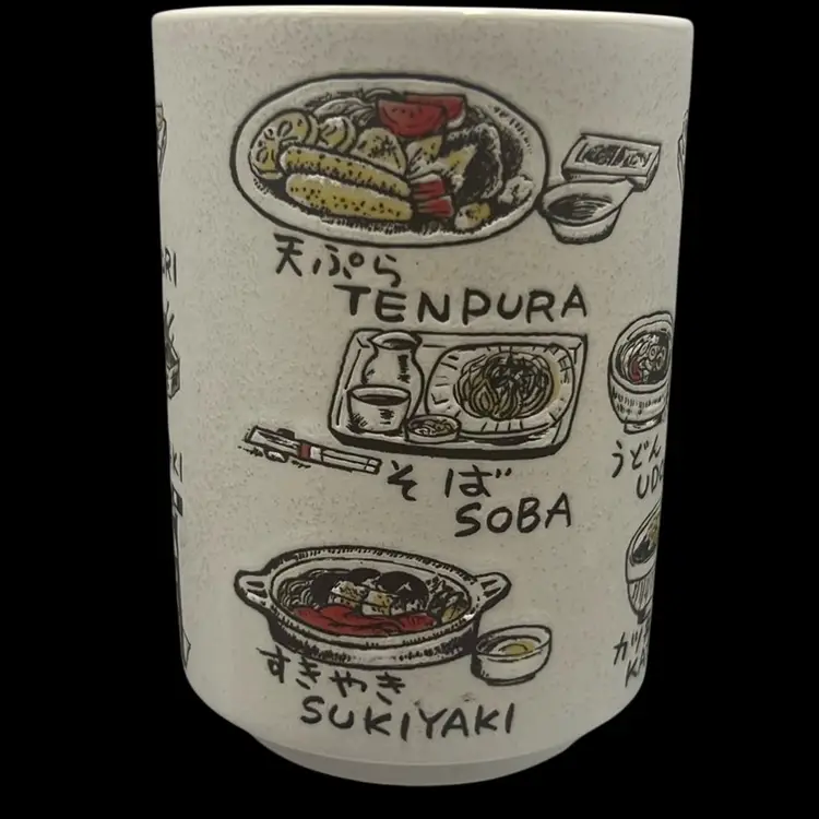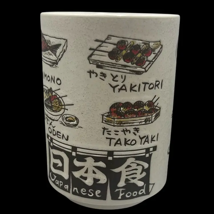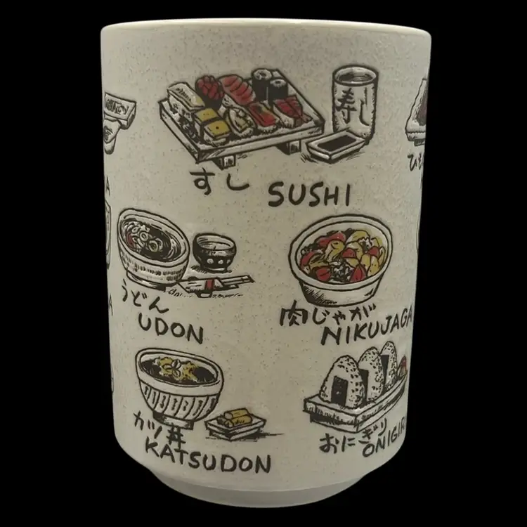 Fun ceramic Japanese tea cup depicting many different Japanese food options! All your favorites.