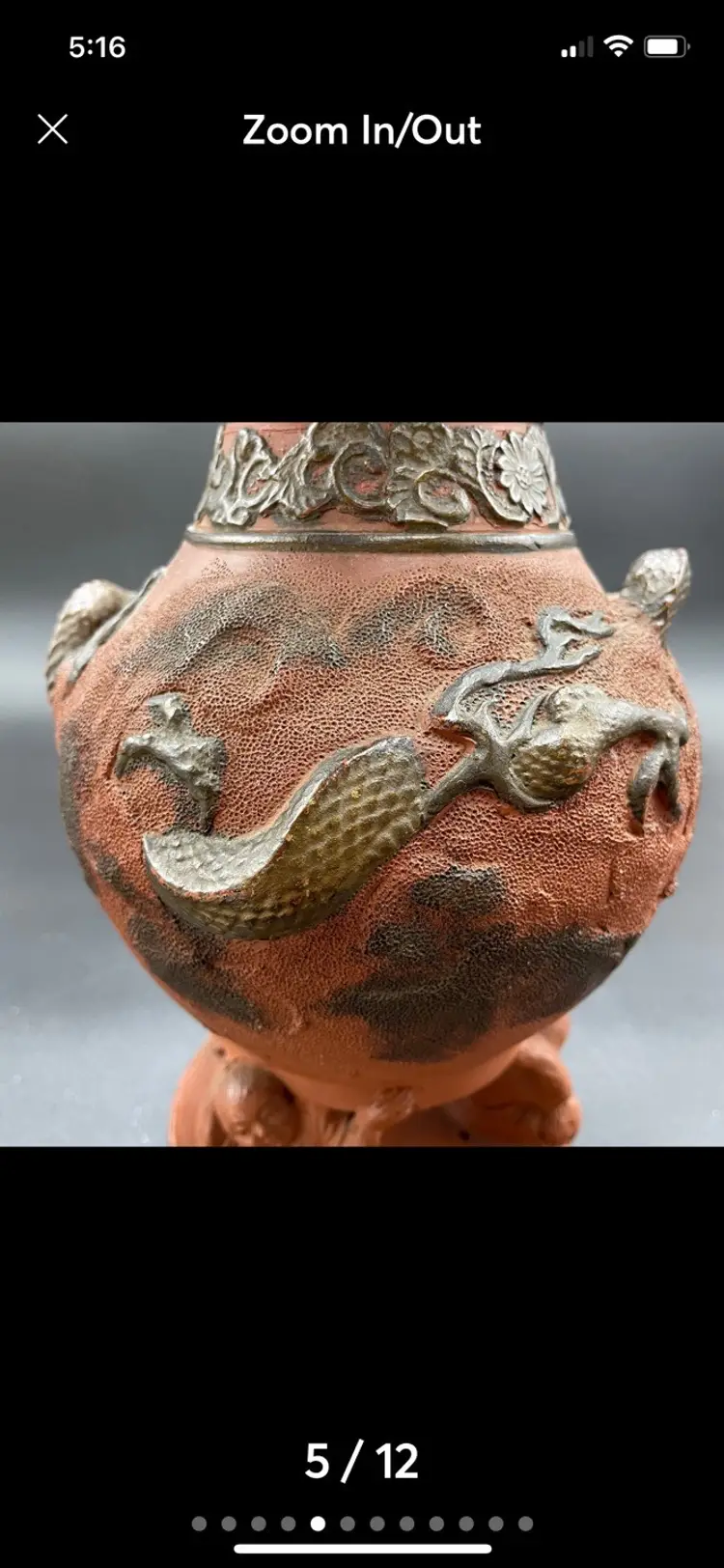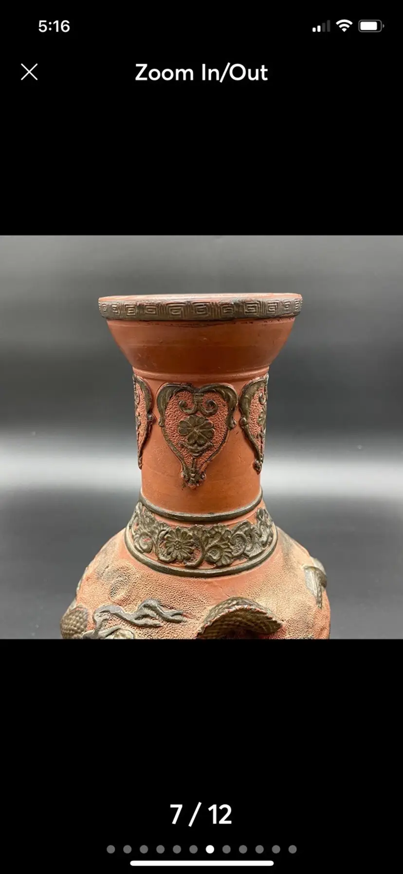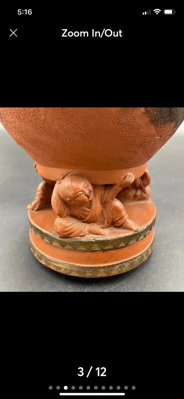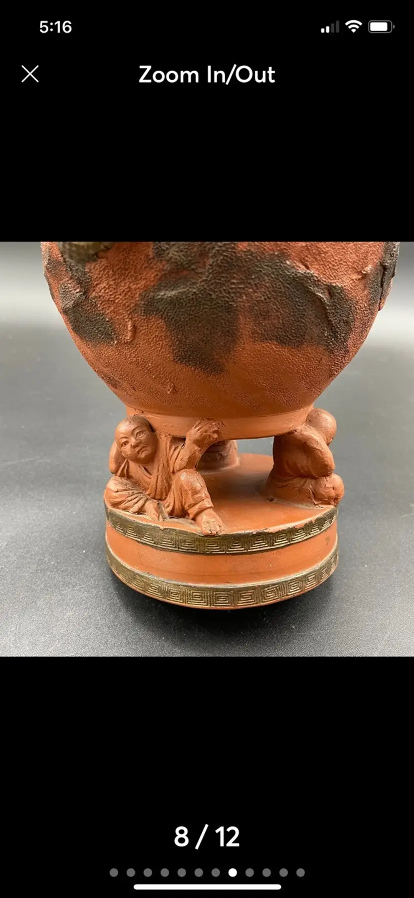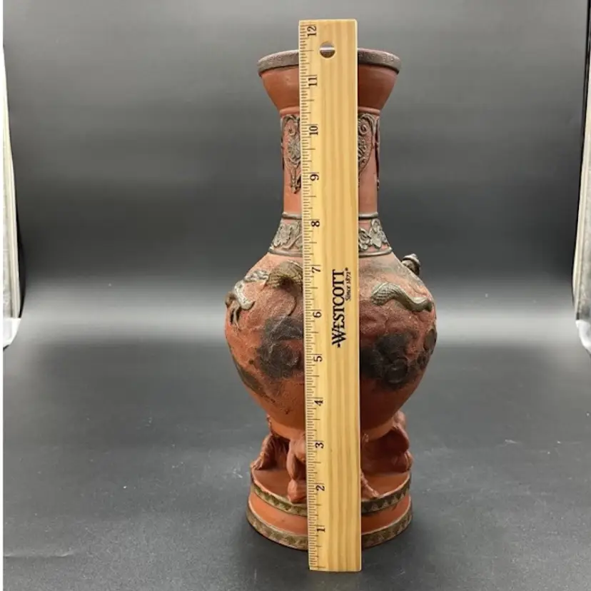 This is a Japanese Tokoname redware pottery vase. It has a 3D three toed dragon among clouds encircling the body. Three 3D figures of Hotei (God of Good Luck) are holding the body up from the base. It is marked on the bottom. Measures approximately 12" tall. It is heavy, weighing a little over 4 pounds. No chips or cracks.