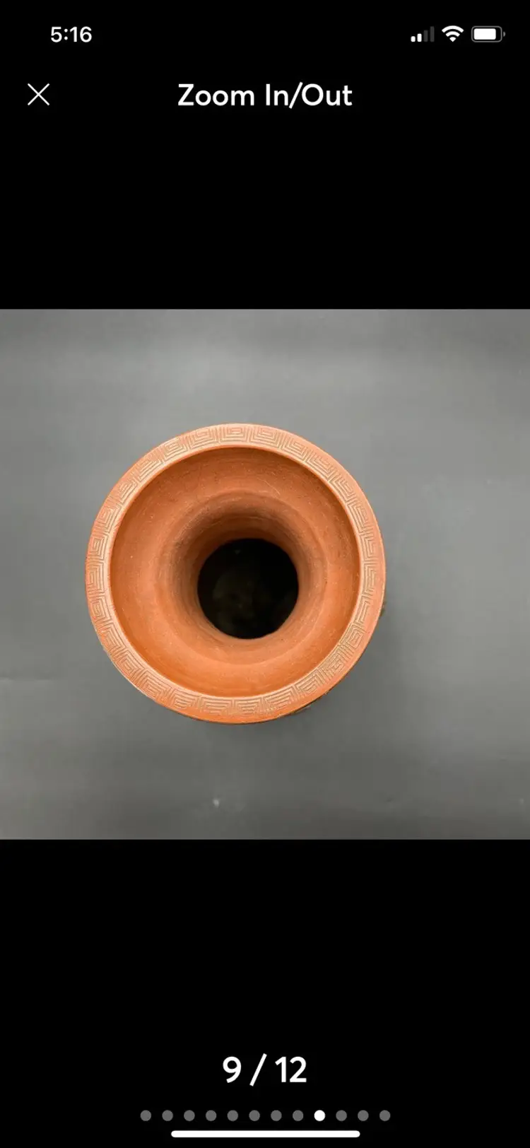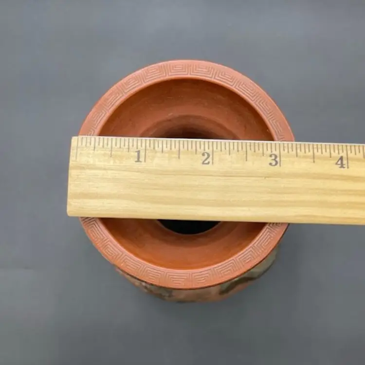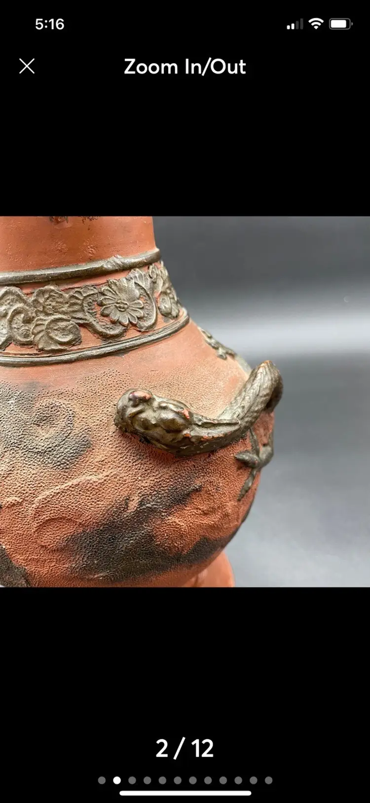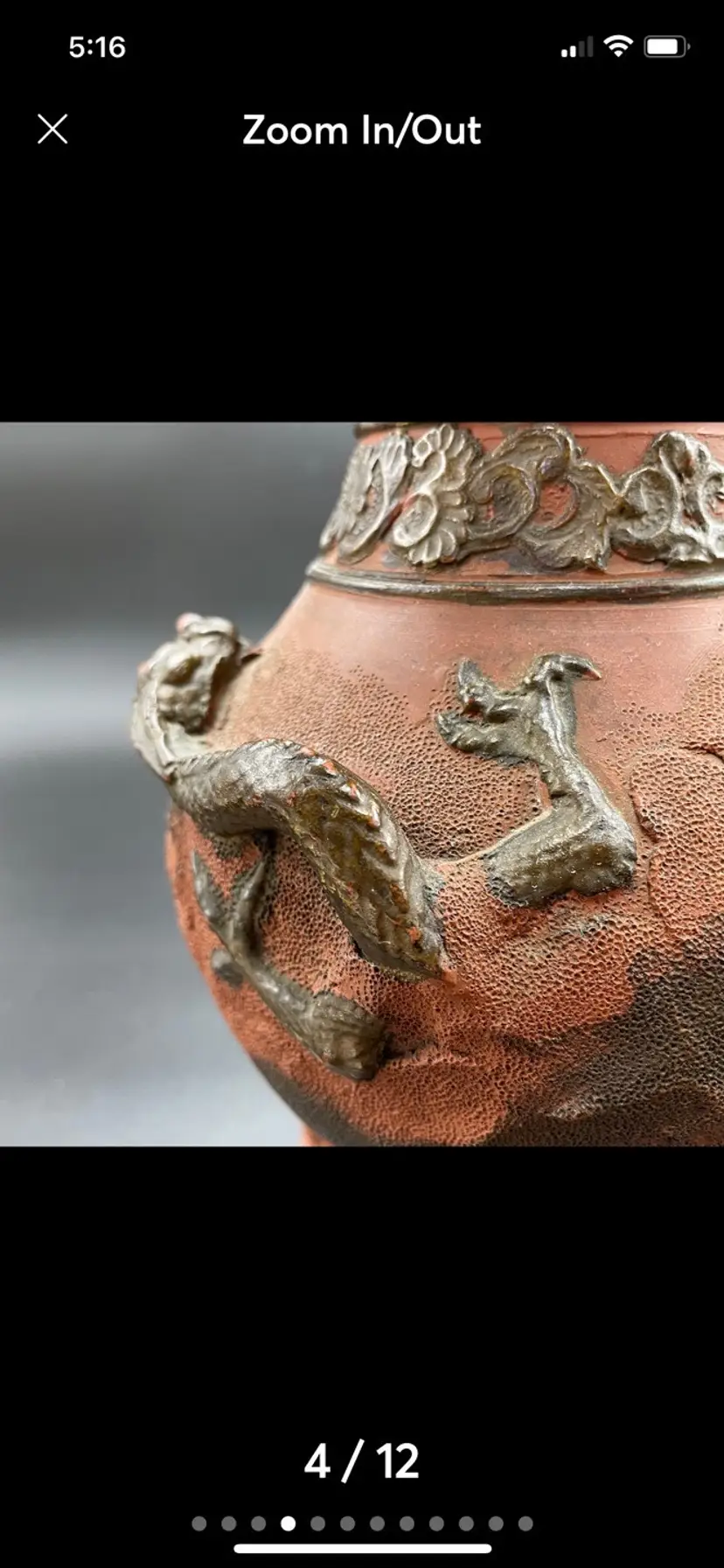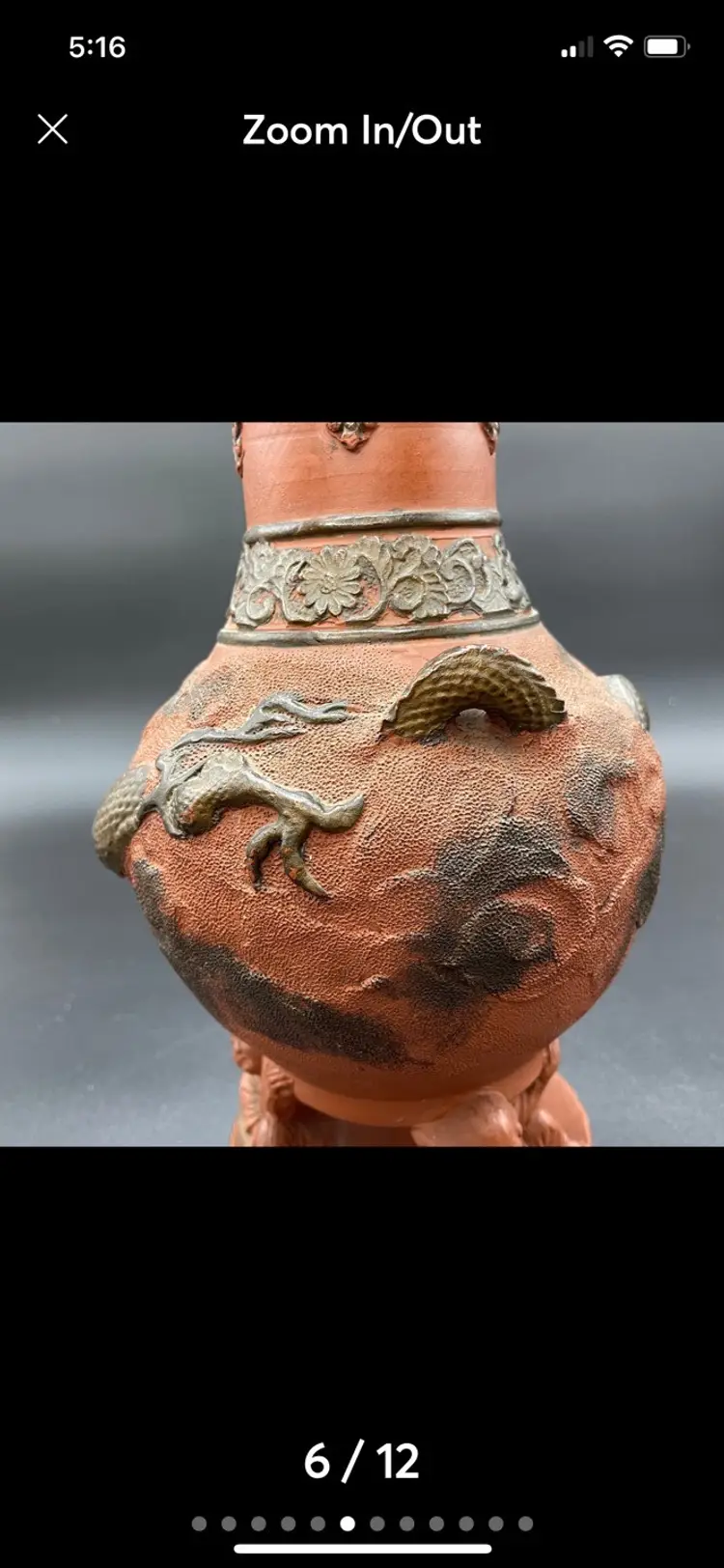 This is a Japanese Tokoname redware pottery vase. It has a 3D three toed dragon among clouds encircling the body. Three 3D figures of Hotei (God of Good Luck) are holding the body up from the base. It is marked on the bottom. Measures approximately 12" tall. It is heavy, weighing a little over 4 pounds. No chips or cracks.