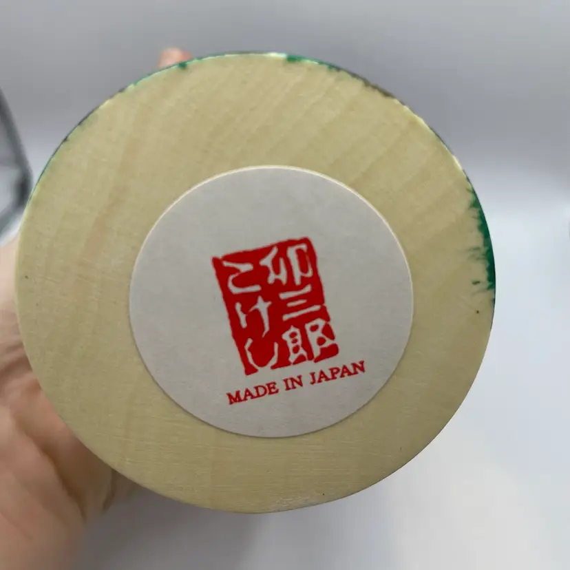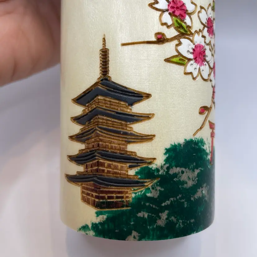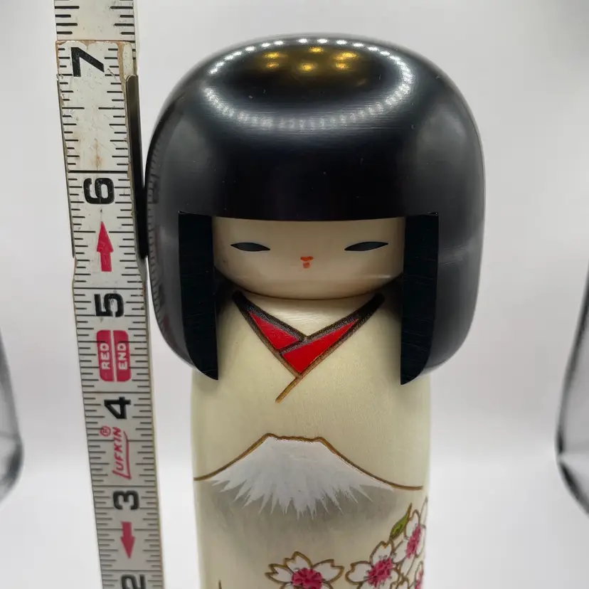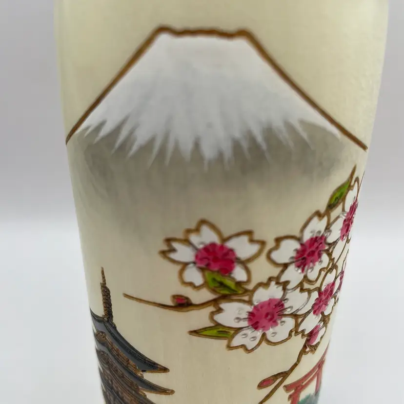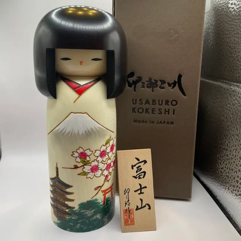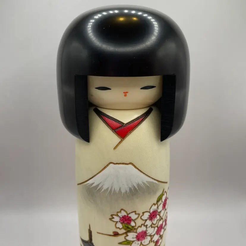 Beautiful tall Kokeshi doll with cherry blossoms, Mt. Fuji, and a pagoda with original box. 7.25"tall, 3" wide, excellent condition