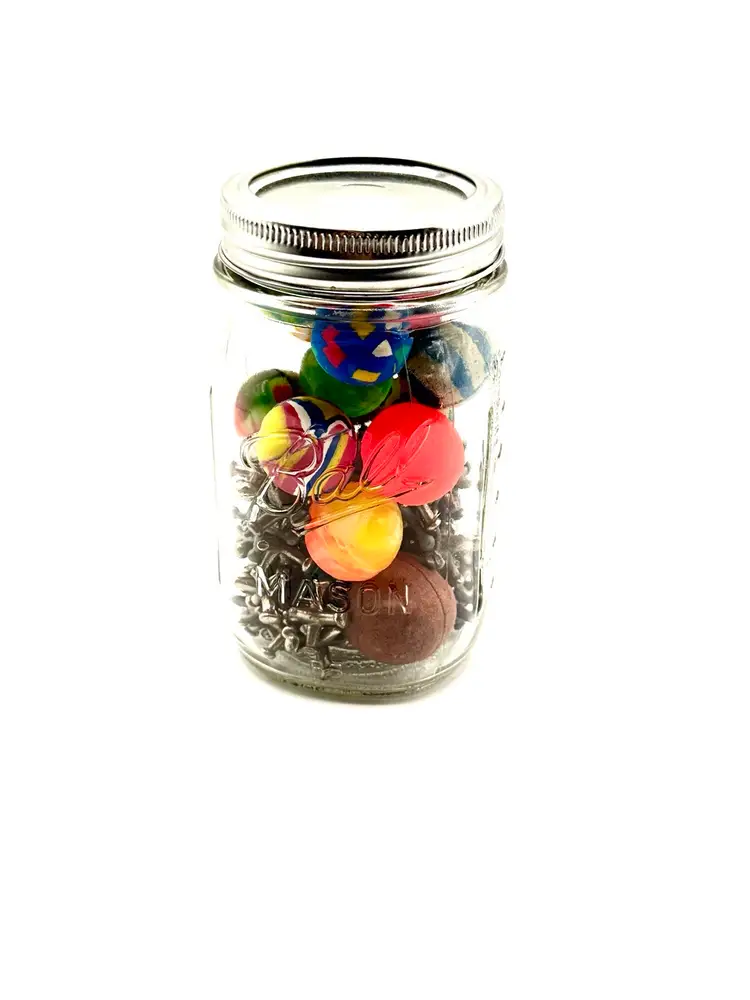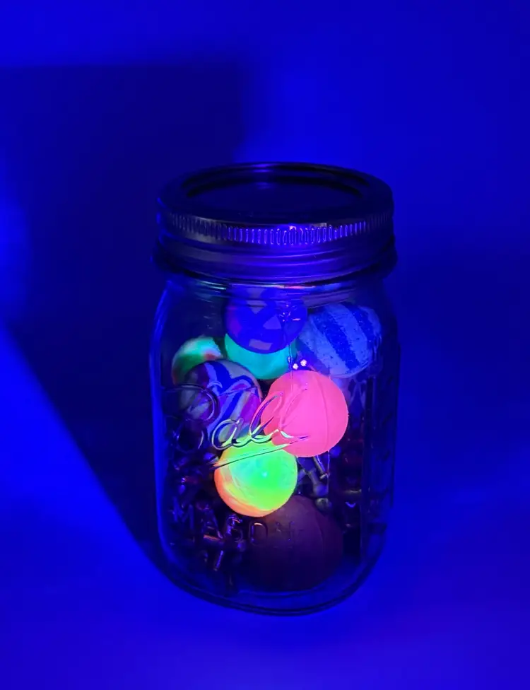 Jar Of Jacks & Glowy Bouncy Balls. 5.25” UV Reactive