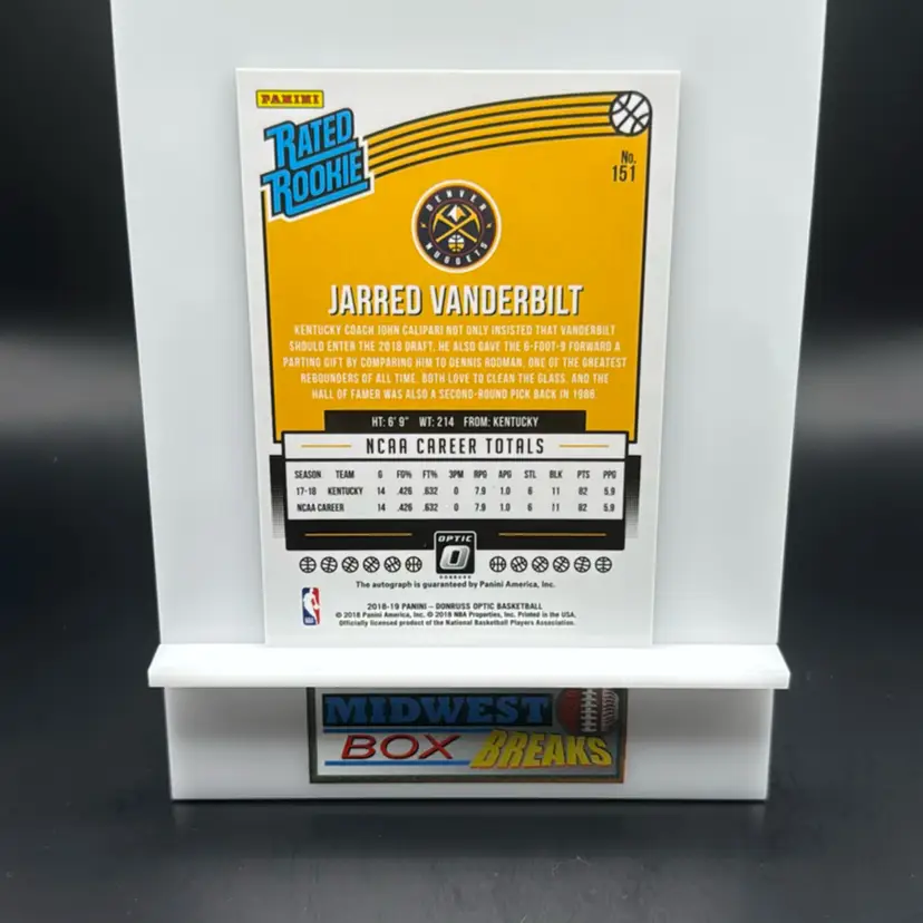 Jarred Vanderbilt Auto Rated Rookie 2018-19 Donruss Optic Denver Nuggets MBBCRD