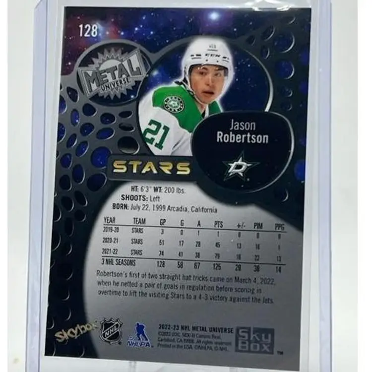 Jason Robertson 2022-2023 Skybox Metal Universe Hockey Blue Spectrum FX Dallas Stars. Shipping is $1 for the first card, +$0.50 for additional cards, and ships PWE within 1-2 days.