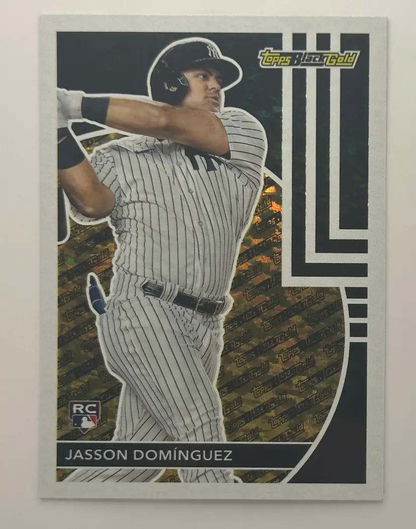 Add this Jasson Domínguez rookie card from Topps Black Gold to your collection, showcasing the Yankees prospect in his iconic pinstripes.