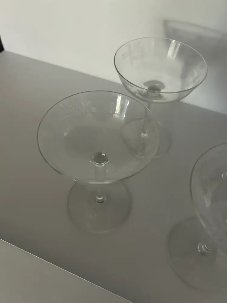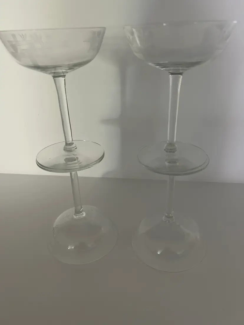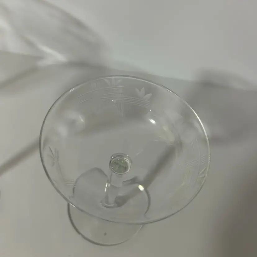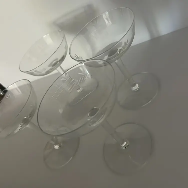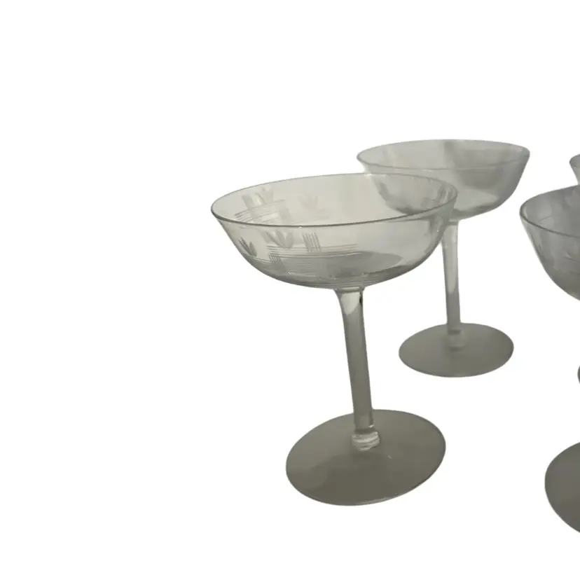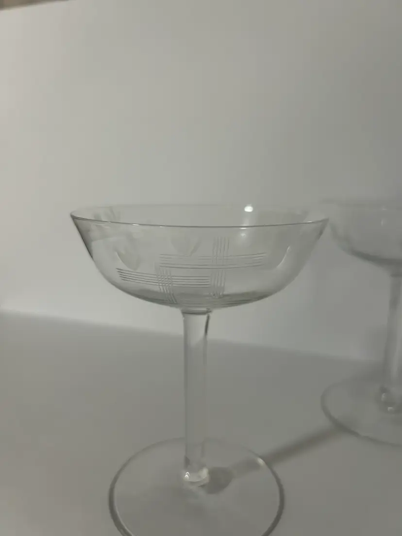 Etched crystal stemware, often classified as champagne saucers or sherbets. Features delicate etched wheat stalks and crossed lines. Mid-century modern, specifically popular in the 1950s and 1960s glasses are in mint condition with no chips or cracks and they measure approximately 5 inches tall and approximately 4 inches in diameter. (BSA*IC)