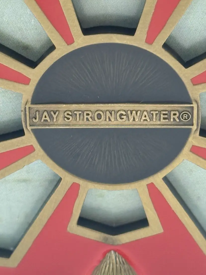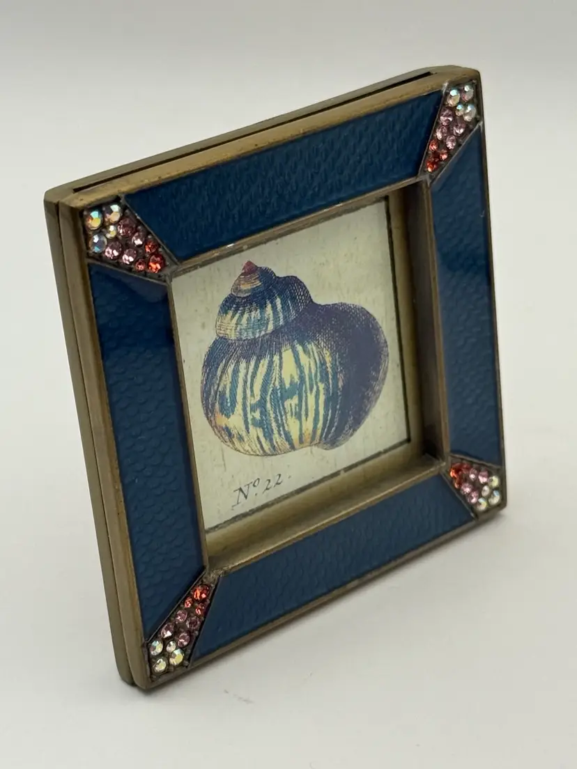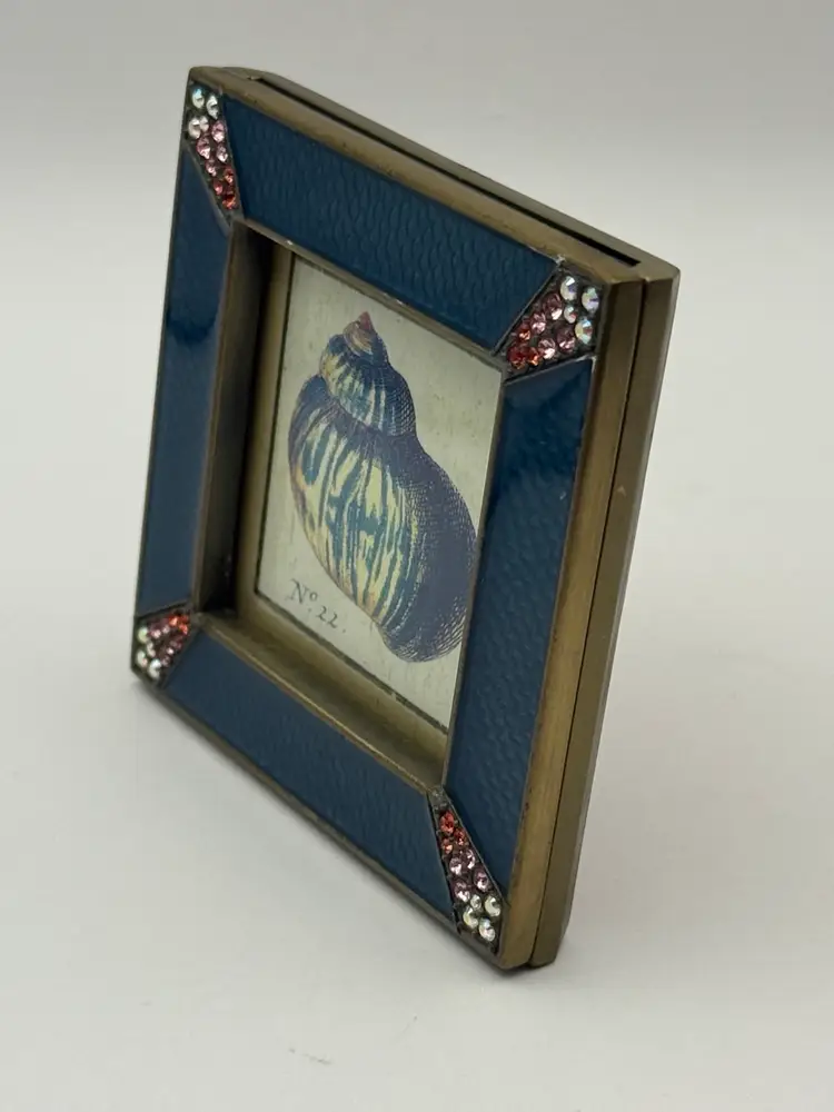 Beautiful vintage Jay Strongwater "Leland" picture frame . It features a deep blue-colored square enamel frame with brass metal edges. The bluish teal color has a subtle fish scale pattern. The corners are adorned with Swarovski crystals. Frame stands alone. It will accommodate a photo that is approximately 1-3/4" square.