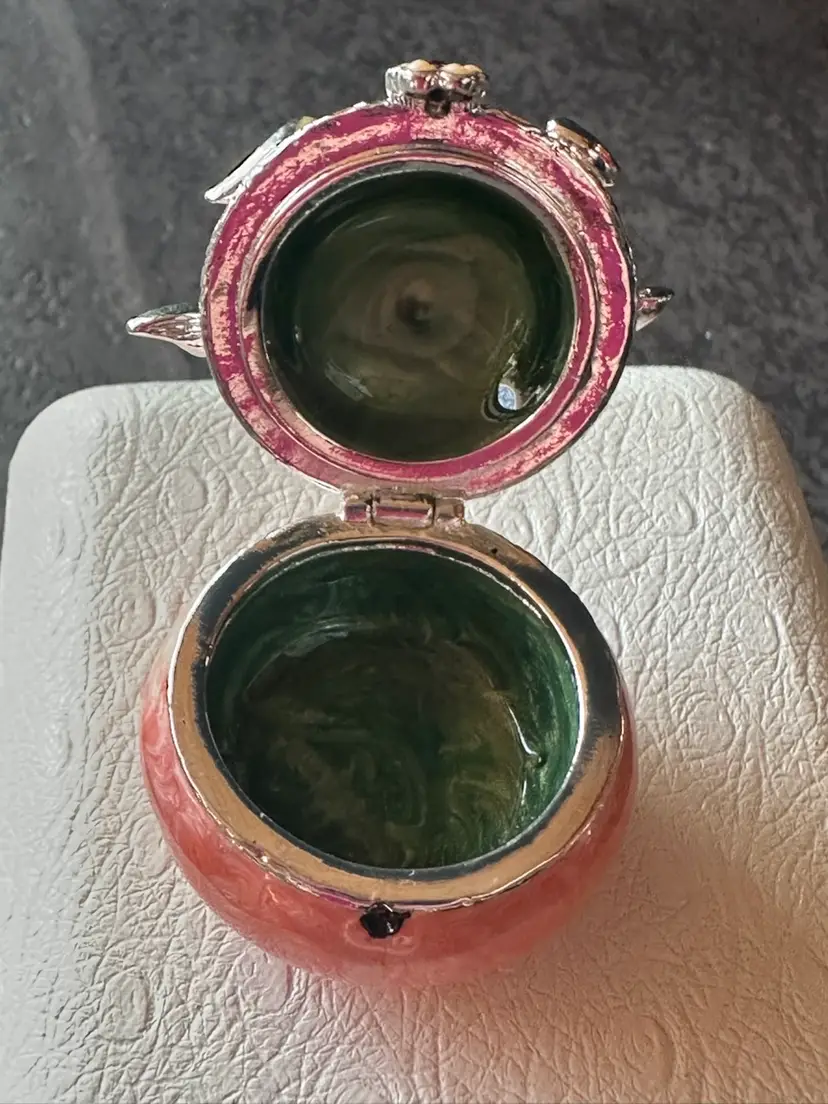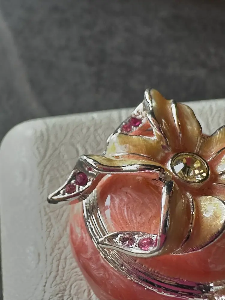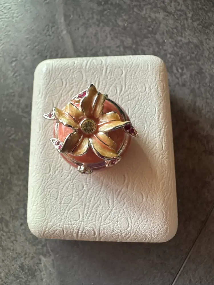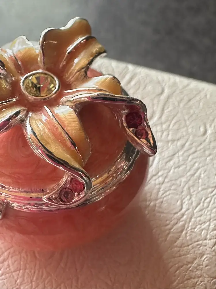 Jay Strongwater Stargazer Lily Flower small trinket box. It is crafted from pewter and dipped in 14K gold. Hand painted enamel with crystals.