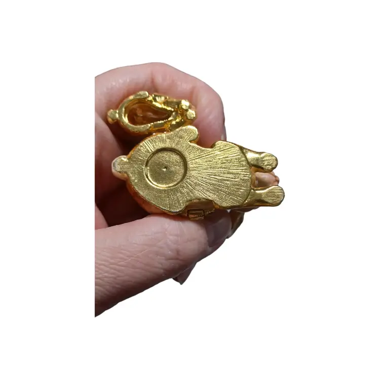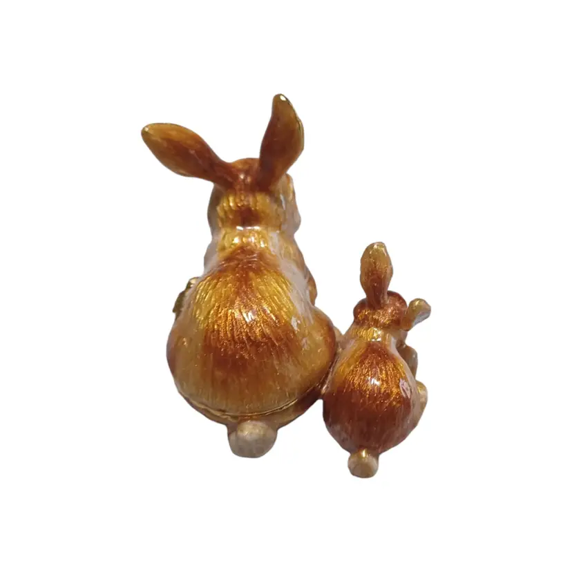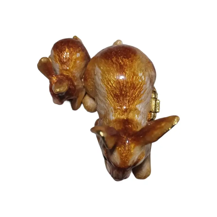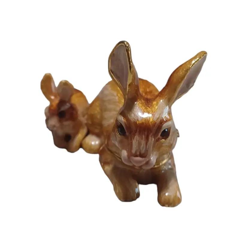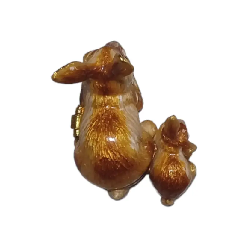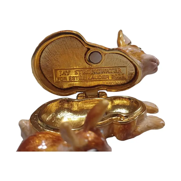 Listed is a highly collectible fine enamel box designed by the renowned Jay Strongwater. It has great details of a mother and baby rabbit; both have tiny Swarovski crystal eyes and golden etched fur that glistens in the light. It was made for Estee Lauder in 2009 as a solid perfume compact. The perfume is no longer in this piece, but it is in excellent, like-new condition otherwise. It measures approximately 1.5 inches tall and 2.25 inches long. There is a nice weight to the piece and the hinge on the box works perfectly.