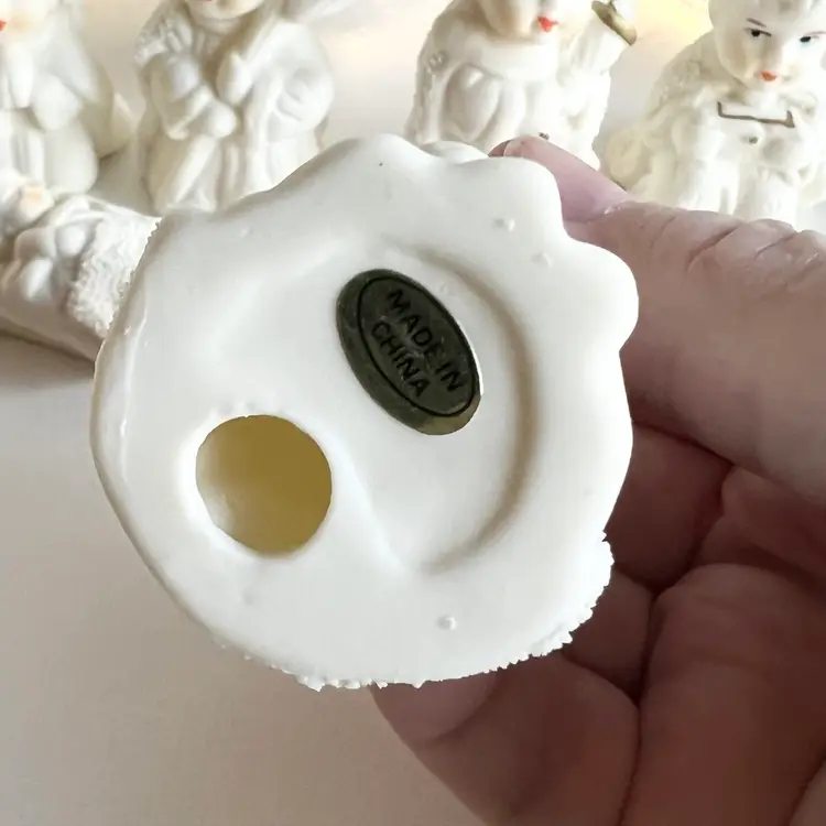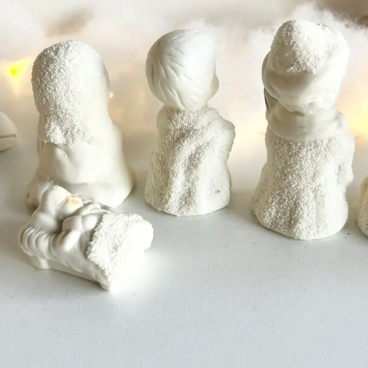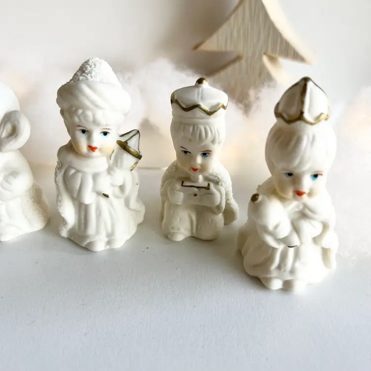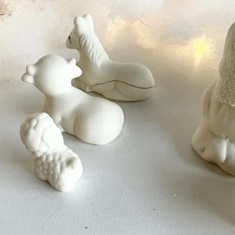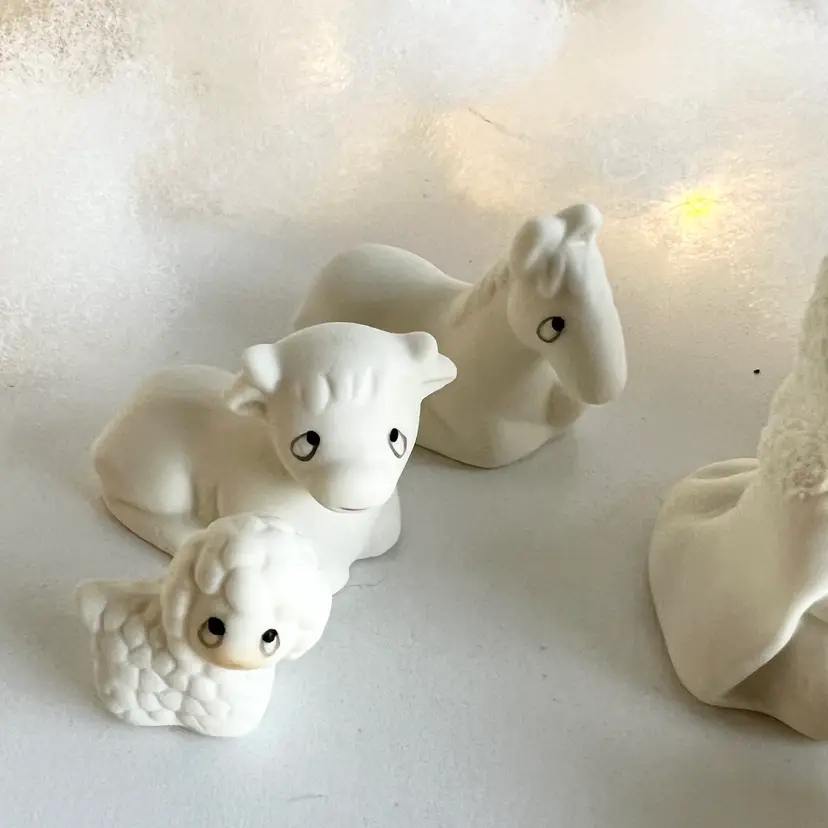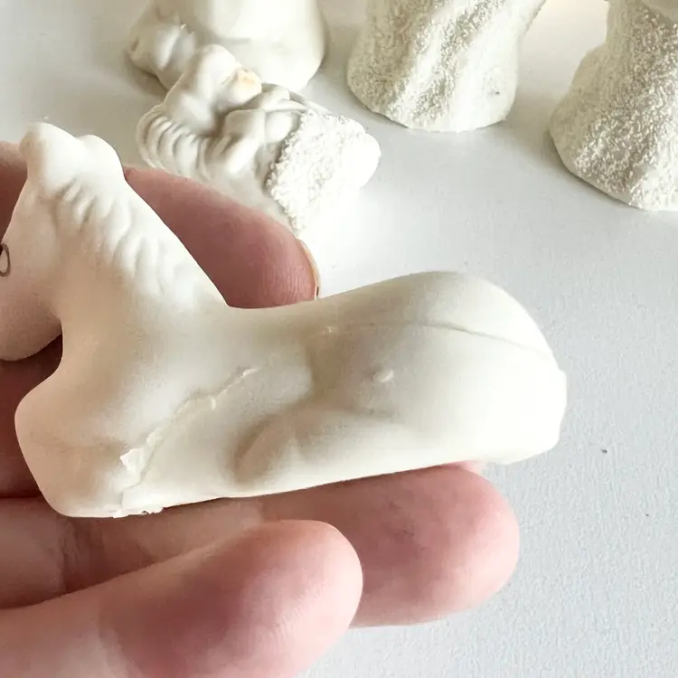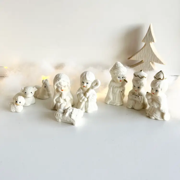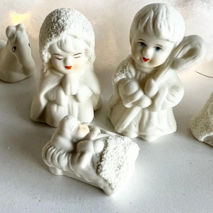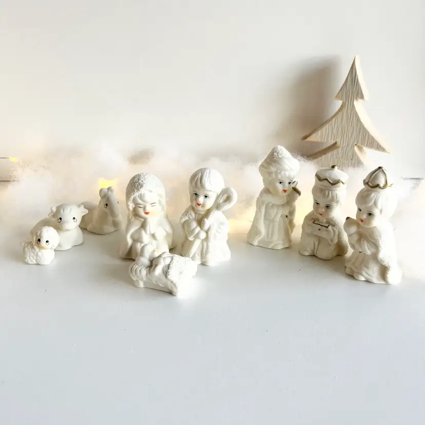 This sweet little nativity set reminds me of snow babies. It is the best porcelain with texture, gold accents and hand painted facial features… look at the sweet little heart shaped mouths! The set is an excellent condition, except for the horse. He has a break and a bad repair on the back. The tallest pieces about 3 inches. And they are approximately 2 inches wide. Ships from Canada.