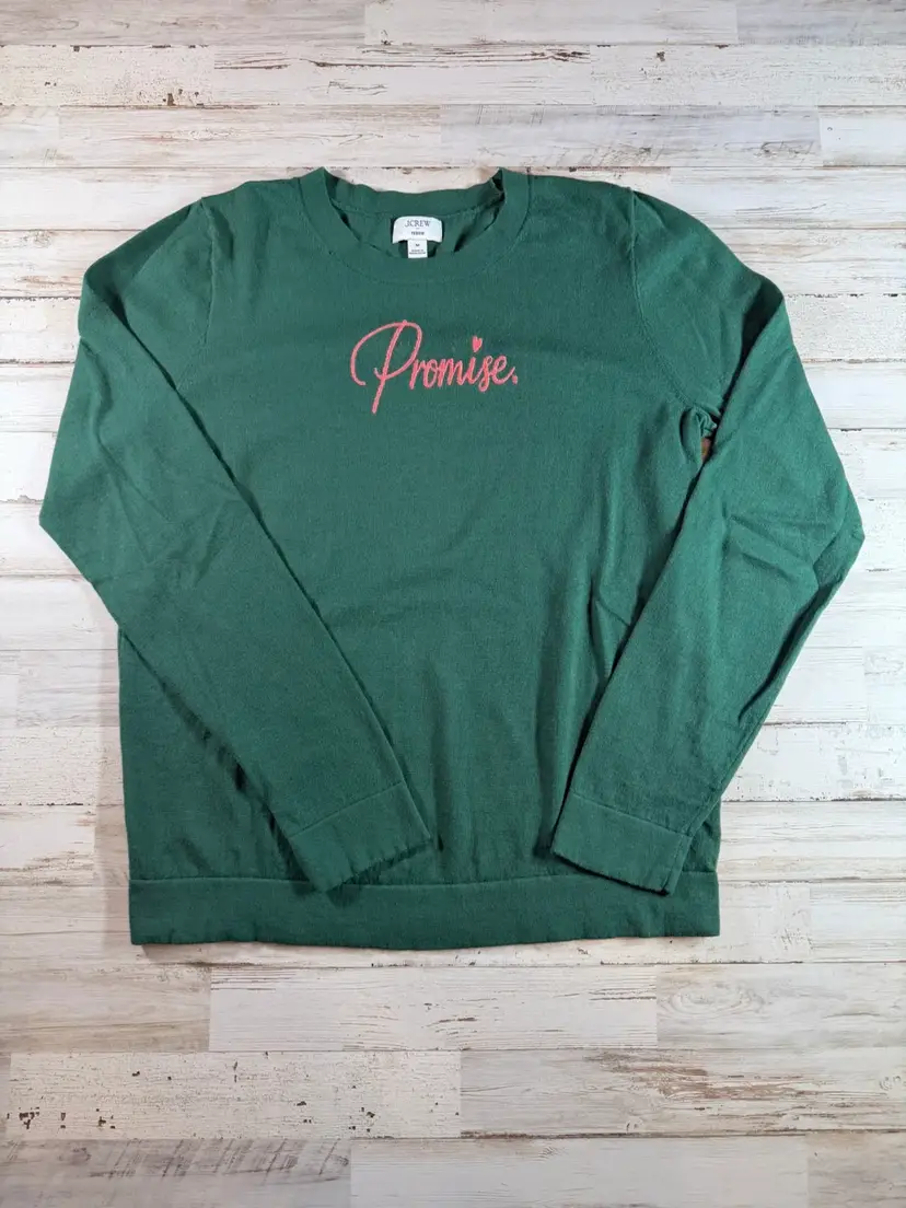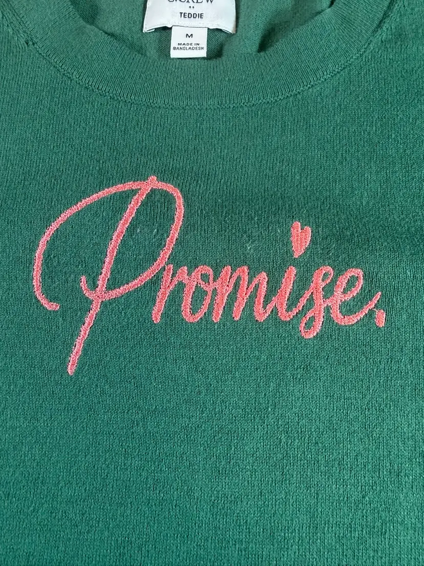 This J.Crew Teddie sweater has been thoughtfully customized with hand-guided machine embroidery reading “Promise.” in pink thread with a tiny heart detail. Each sweater in this collection is individually stitched—no two are exactly alike.