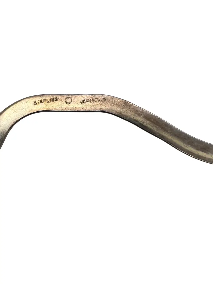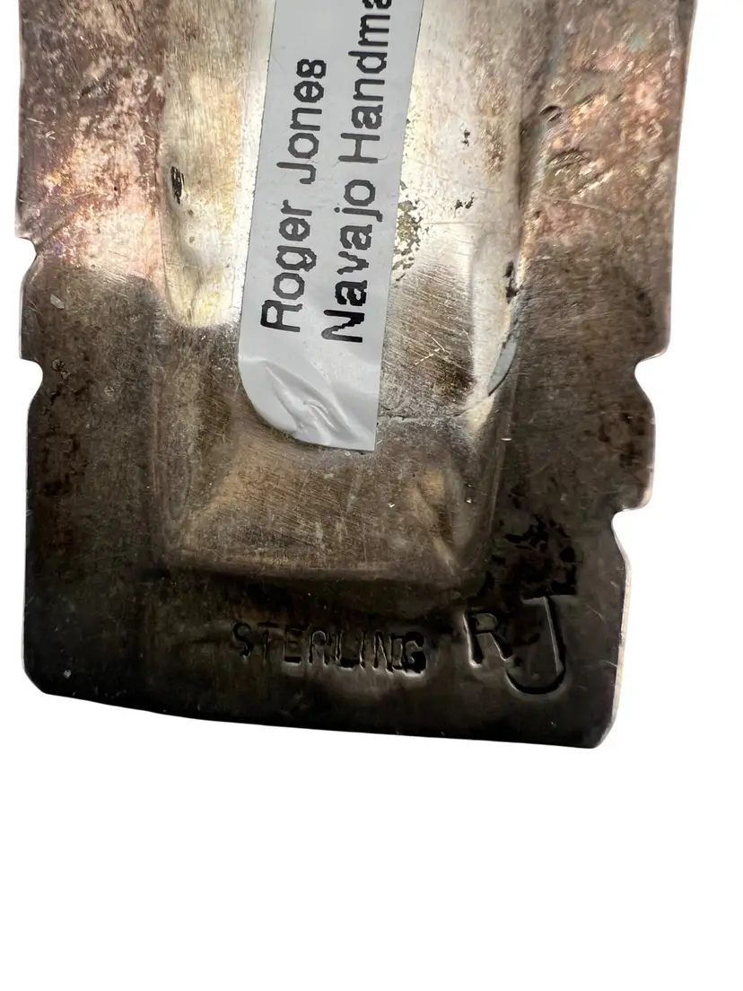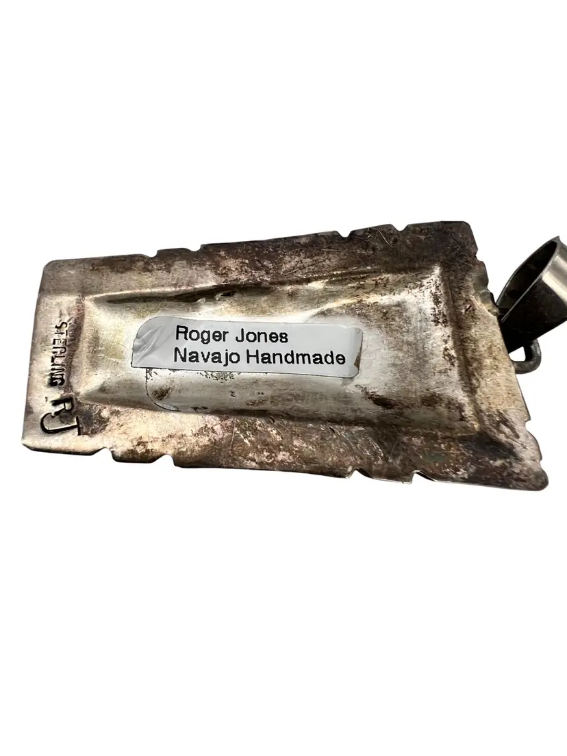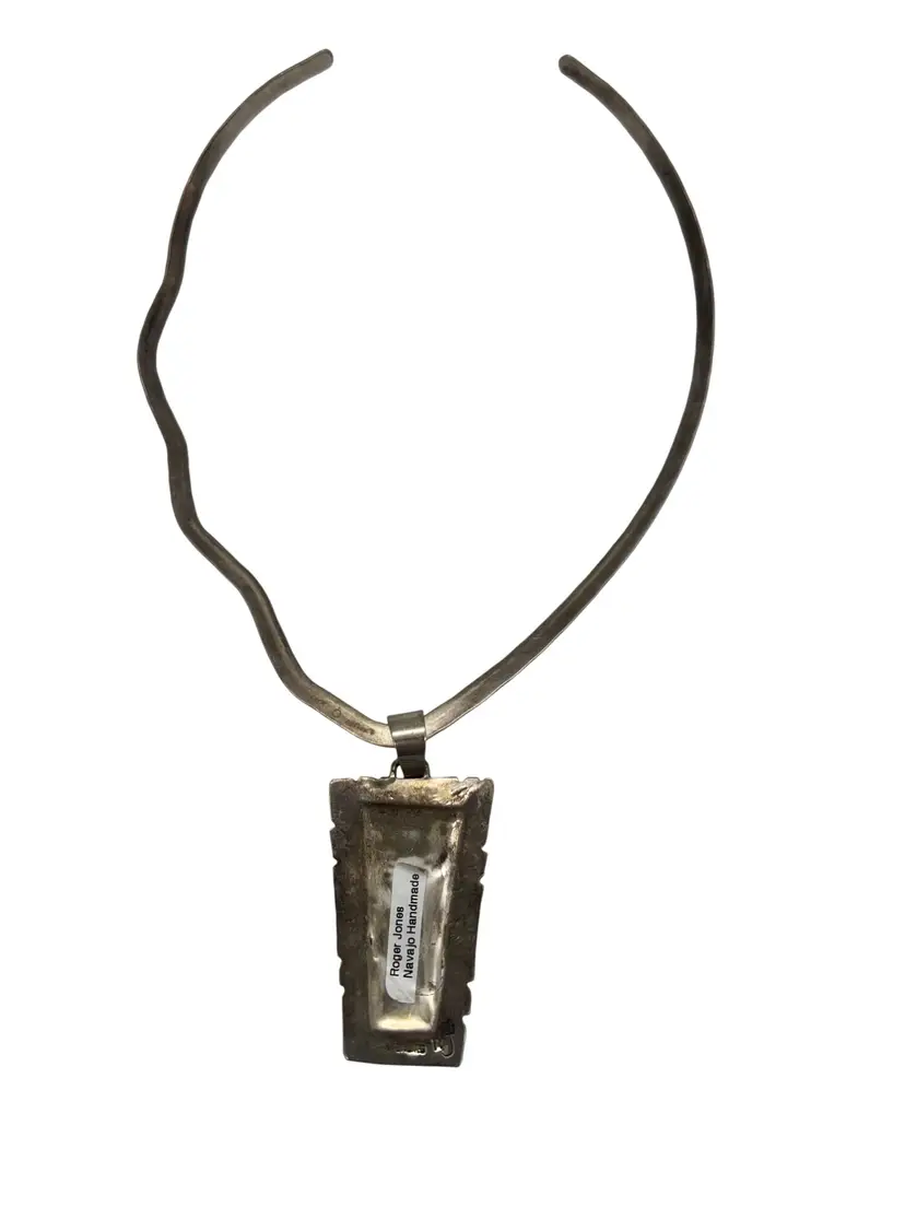 Striking Southwestern artisan necklace featuring a wavy sterling silver collar necklace by Jean Newlin paired with a sterling silver pendant by Navajo silversmith Roger Jones. The pendant showcases intricate silverwork with applied wire designs and three turquoise stones in a raised bezel setting. Pendant is marked "STERLING" and "RJ" for Roger Jones and retains its original label indicating it is handmade Navajo work. The collar necklace is signed "Sterling Jean Newlin." A standout piece of Native American and studio artisan jewelry. Pendant measures approx. 2" long x 1.25" wide. Collar is about 5.25" across at its widest point.