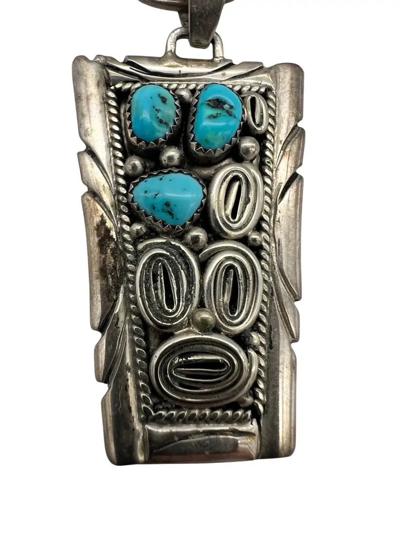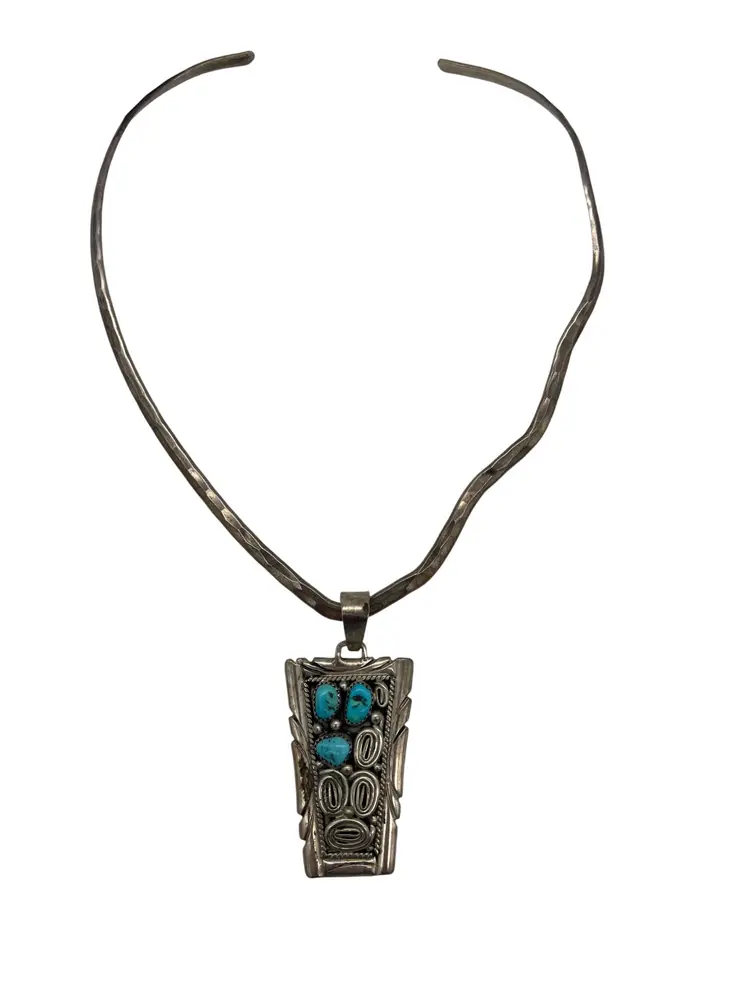 Good vintage condition with age-appropriate wear and patina. Some light surface tarnish and minor scuffs present, especially on the collar. No damage to turquoise stones or structure. See pictures for further details on condition.