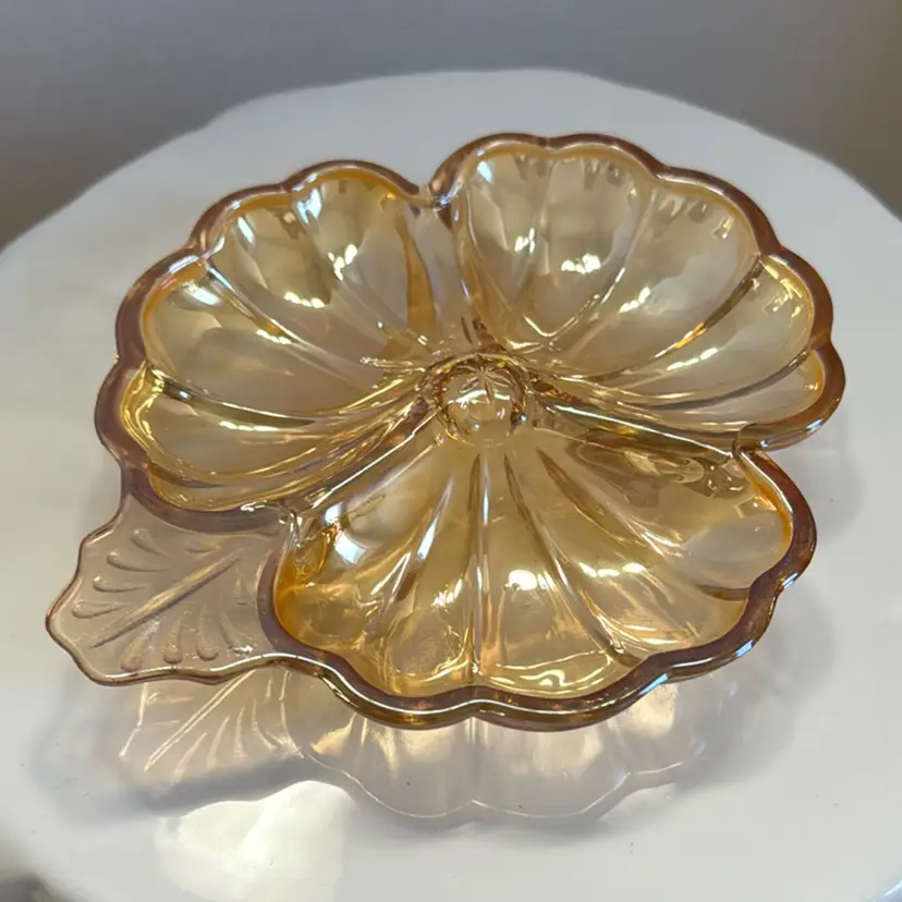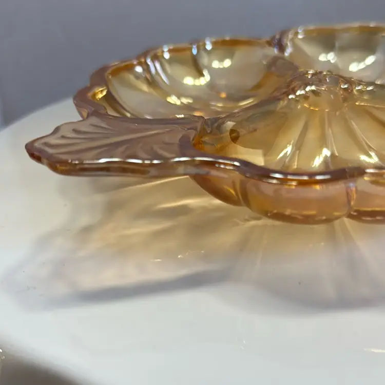 1940s carnival glass clover dish. Beautiful iridescent marigold color. Measures 7 inches long. no chips or cracks.