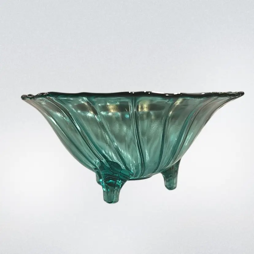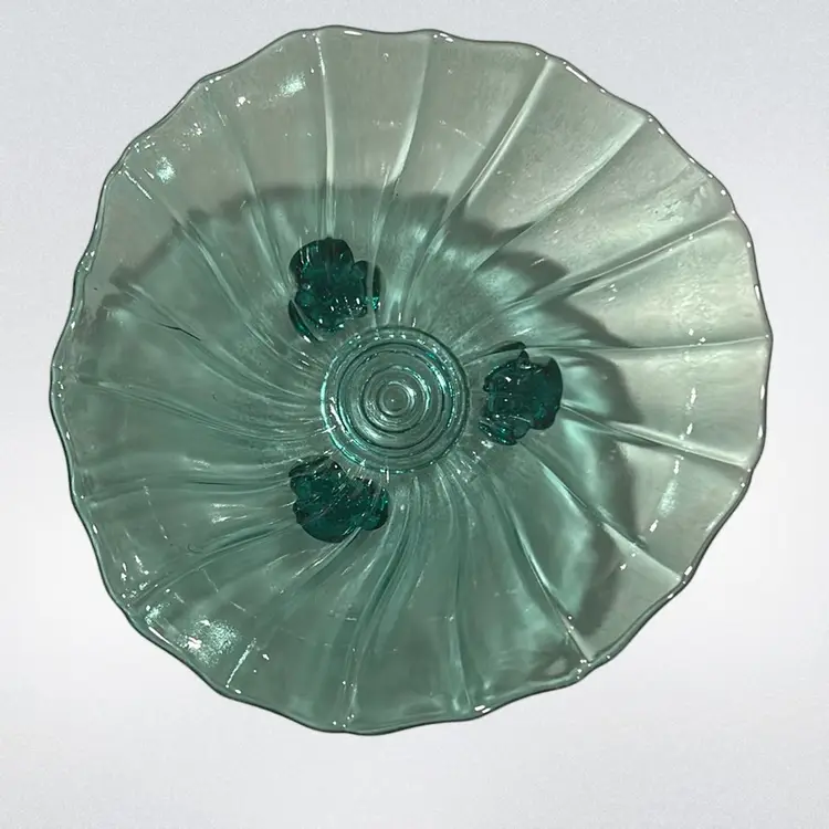 This piece is a Jeanette depression glass ultramarine swirl footed candy dish. It has a distinctive swirl design and three small legs. It stands 3 inches tall and is 6 inches across there are no chips or cracks.