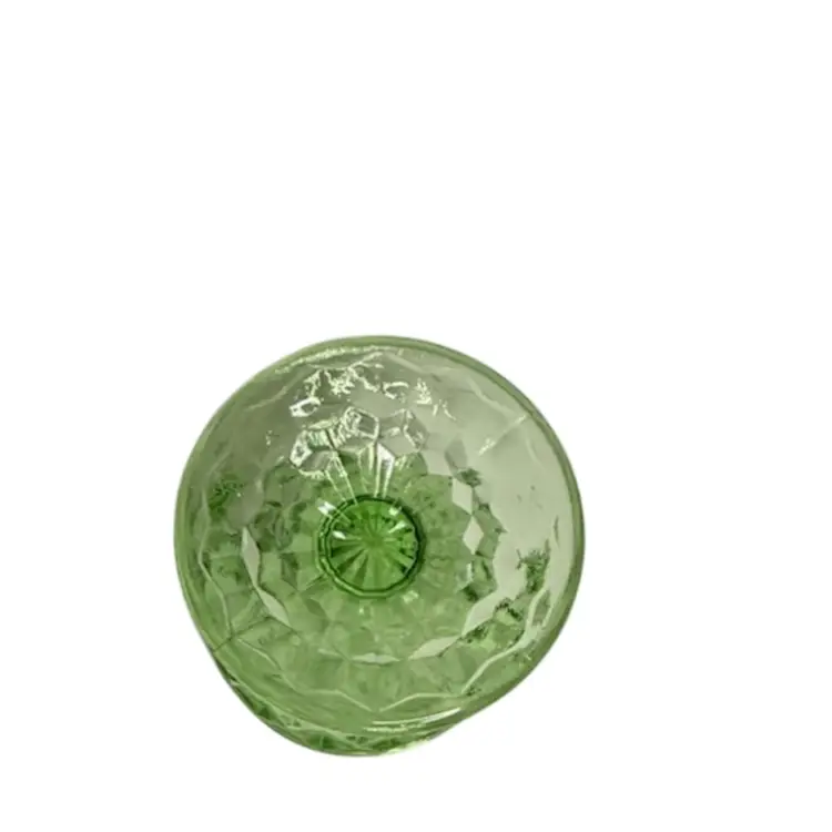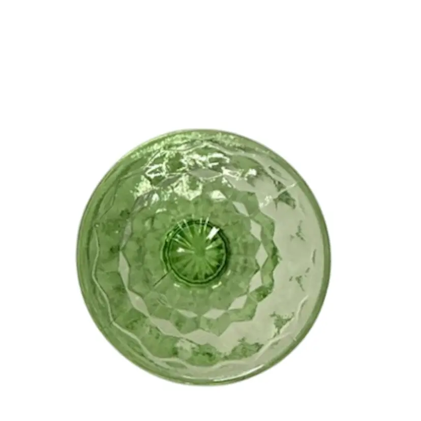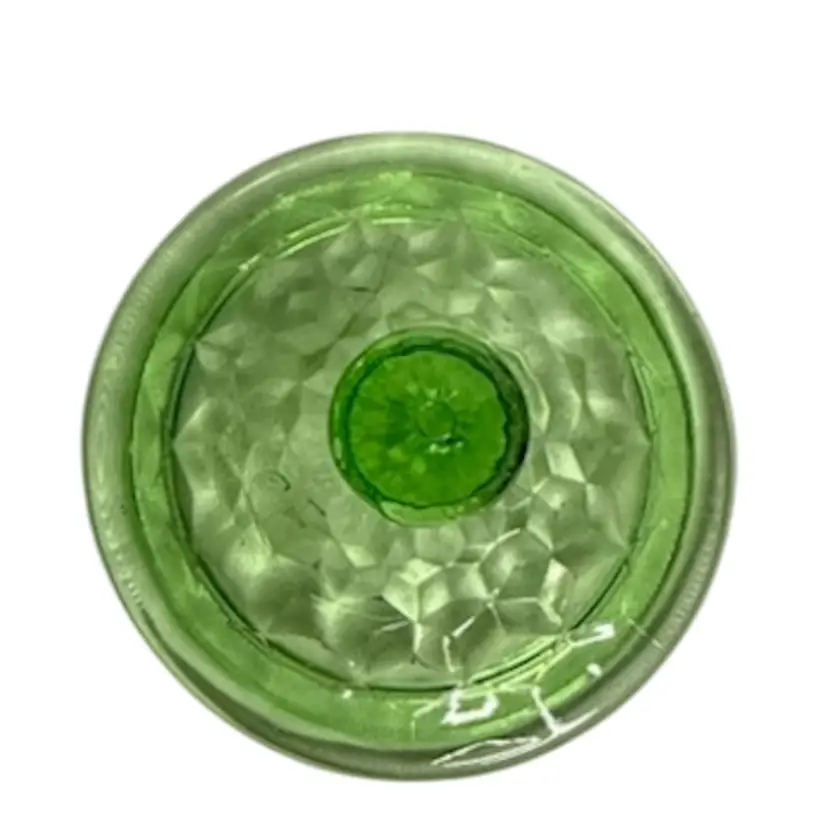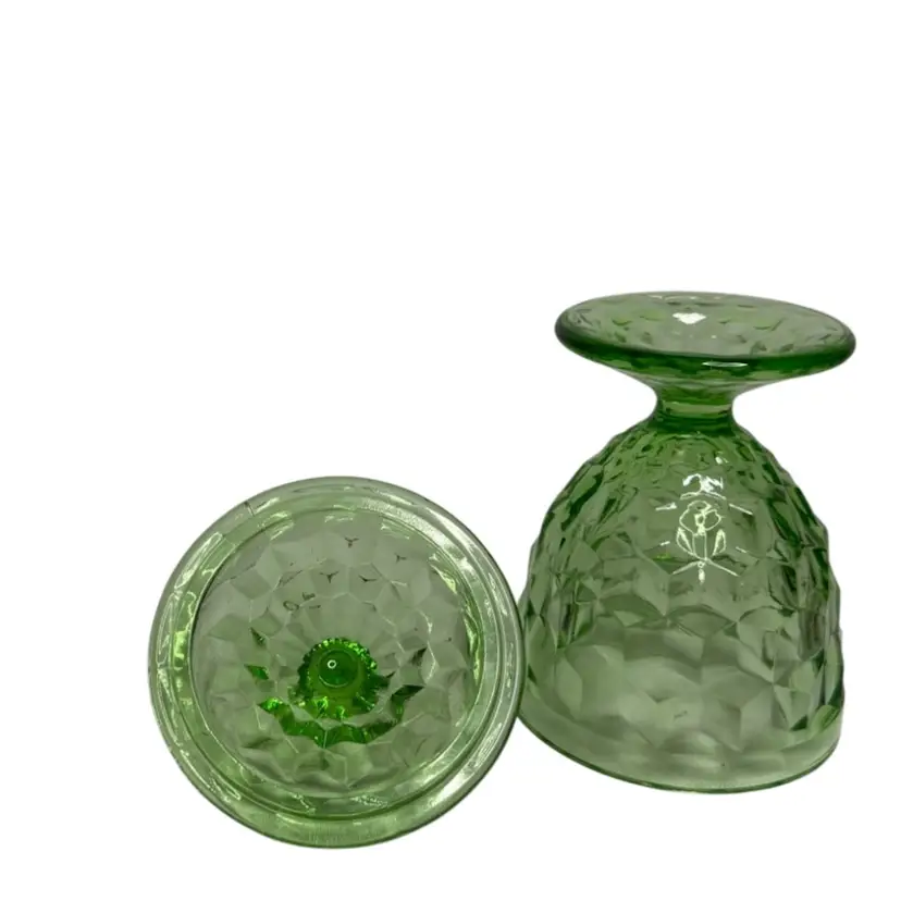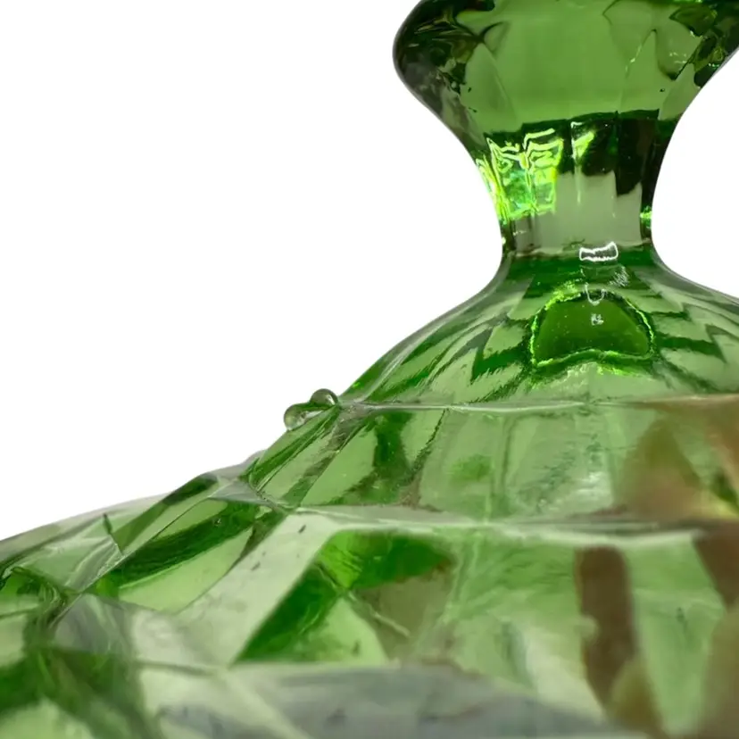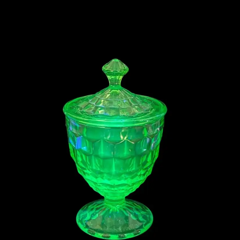 Jeannette Footed Green Uranium Glass Cubist 6" Candy Dish W/ Lid. UV glow with both 365 & 395 black light, shown using a 365 UV light.