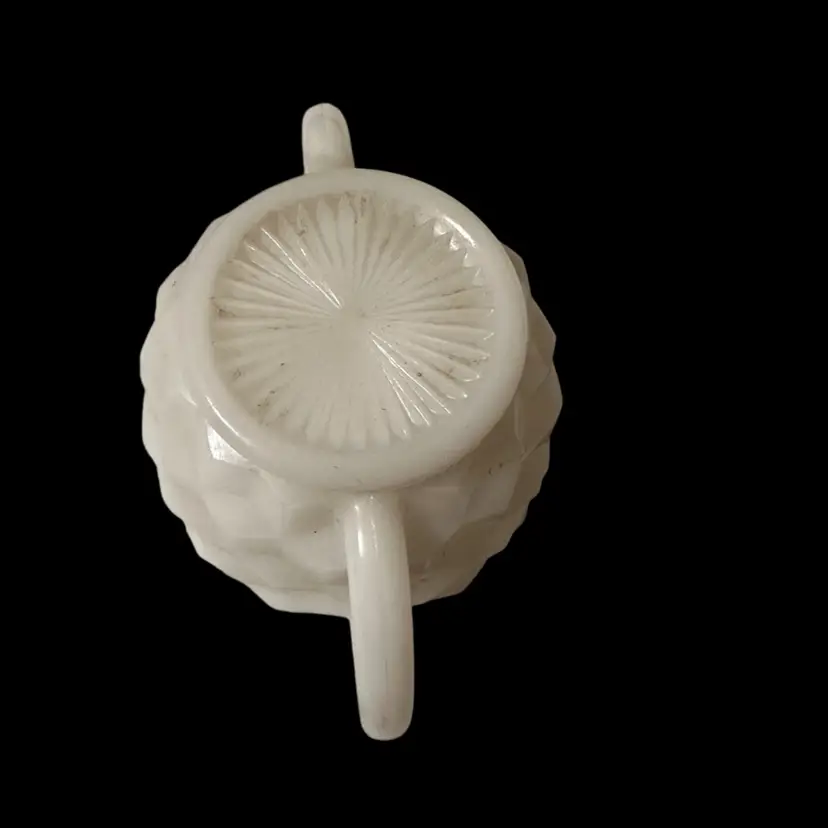 from the 1930s-1950s era. Cubist (also known as Cube or Diamond Cube) featuring a geometric block texture. Opaque white milk glass. Two handles (open sugar bowl design). Dimensions: Approximately 2.25 inches tall and 3.5 inches wide.