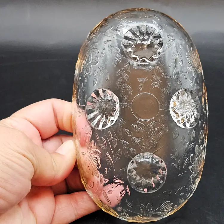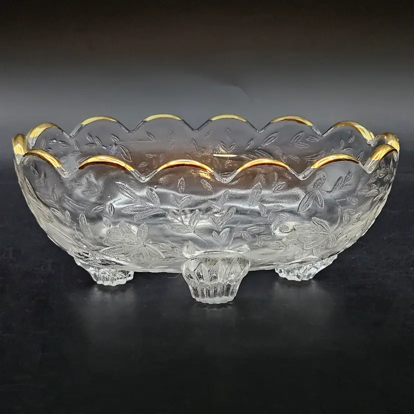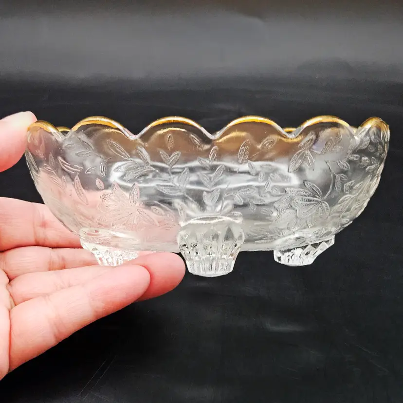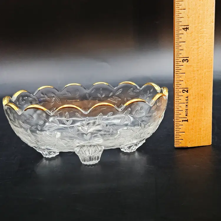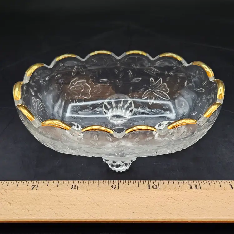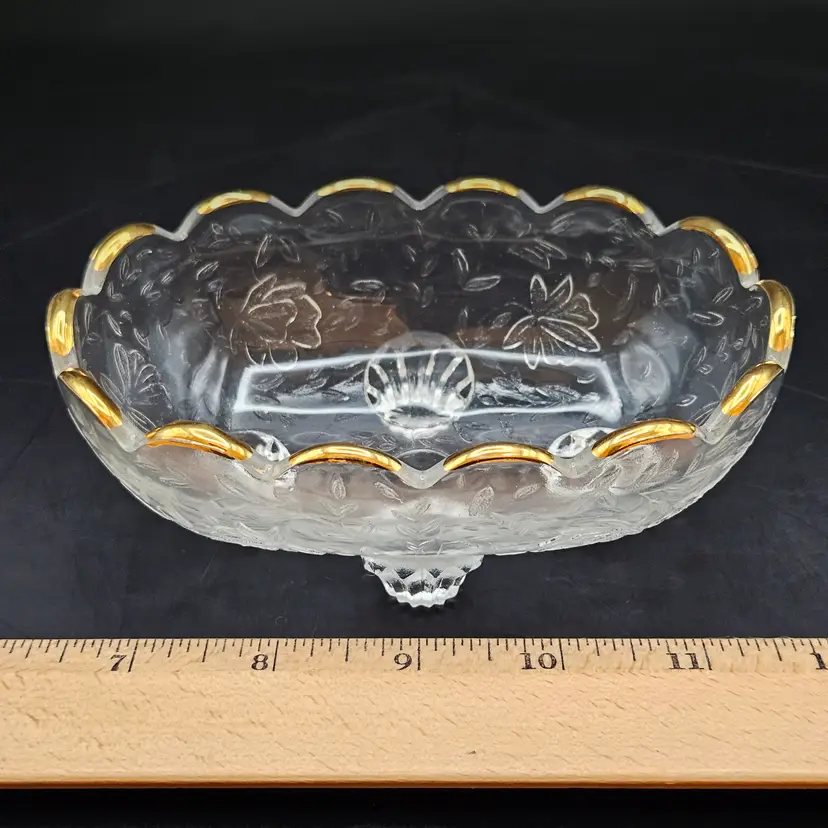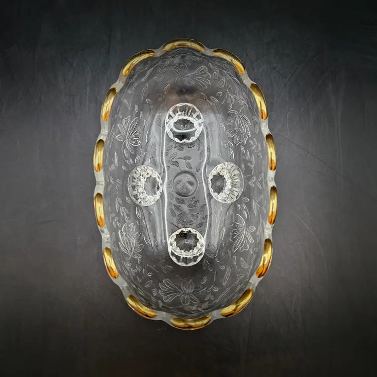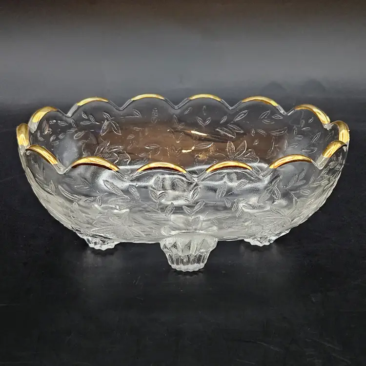 • Maker: Jeannette Glass Company • Pattern: Louisa (Floragold) • Material: Clear pressed glass with gold trim • Shape: Oval with scalloped edge • Base: 4-footed