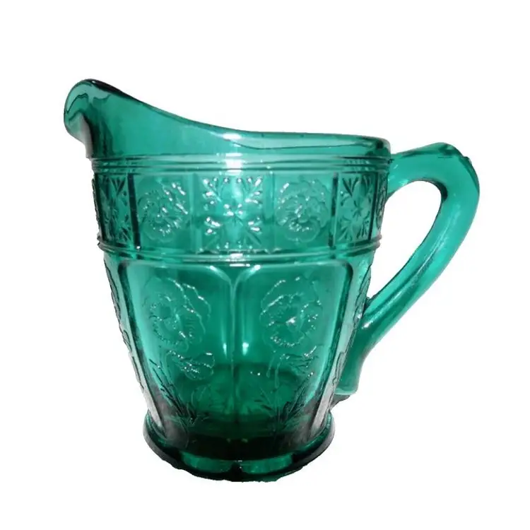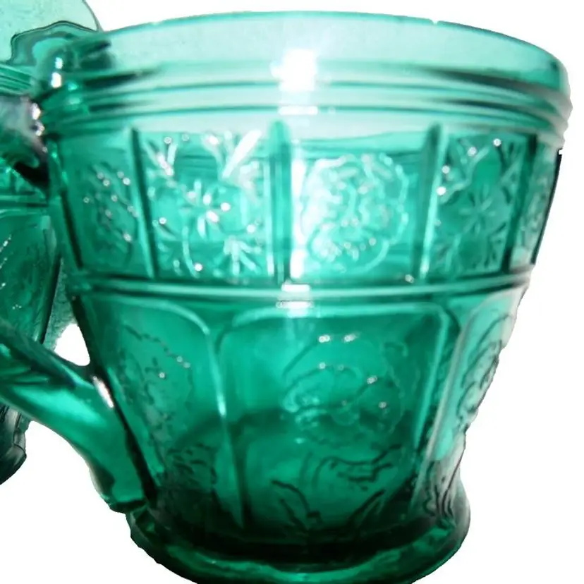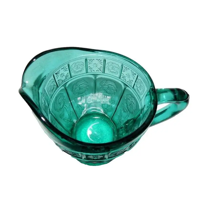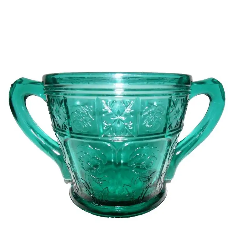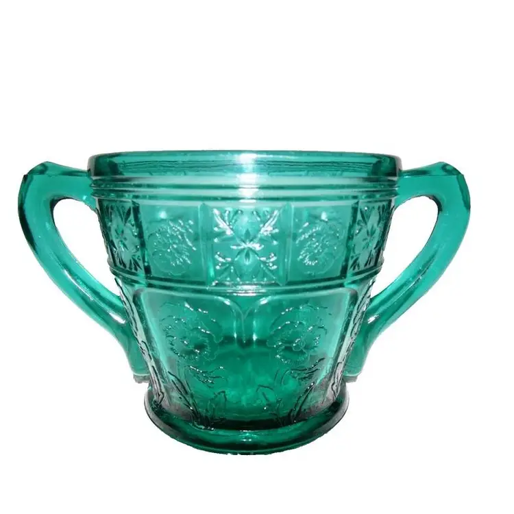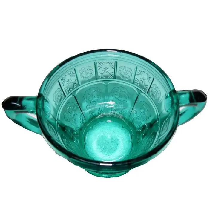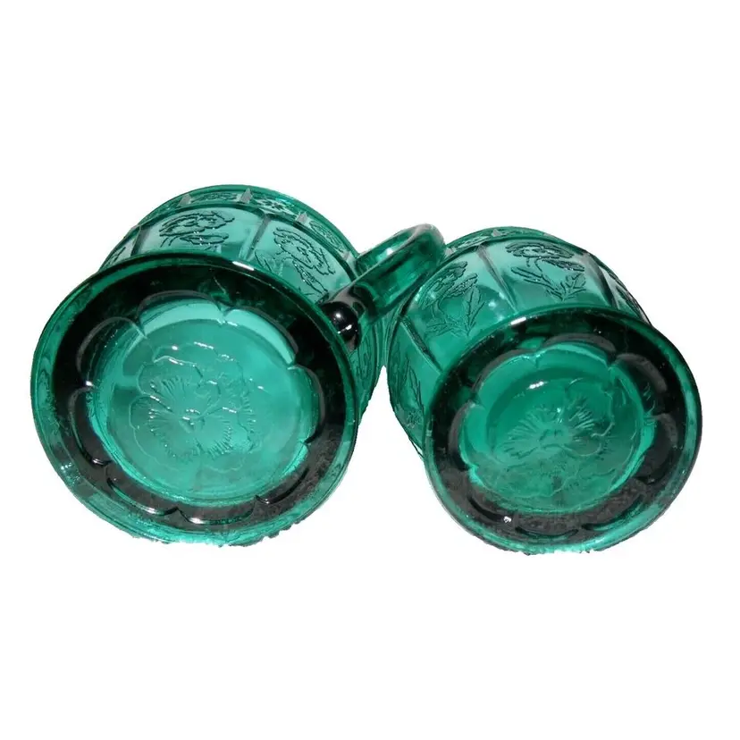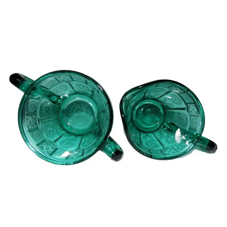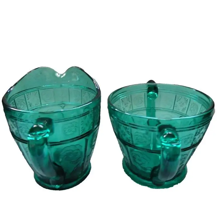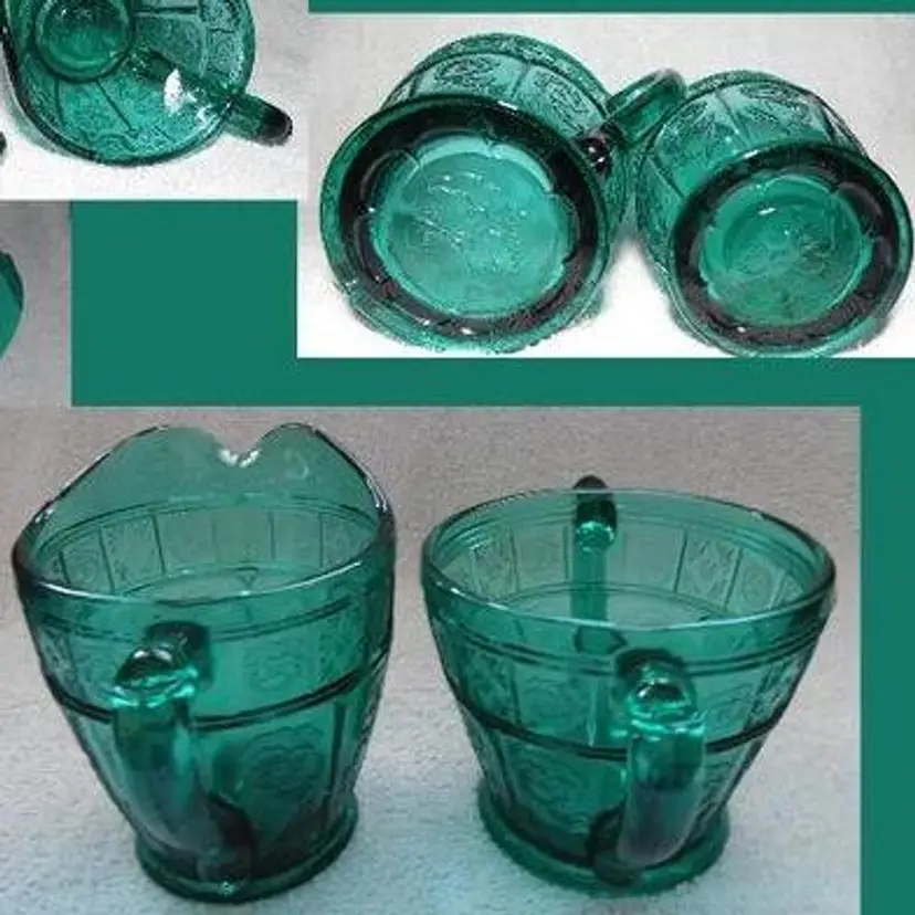 This is a vintage, stunning, Jeannette Glass, Aquamarine / Teal, Doric & Pansy, Large Size, Creamer and Open Sugar set. These were only made from 1937 to early 1938 and is quite scarce in this the LARGE / ADULT sized version of this pattern. Creamer is 4.5" high x 4.75" across