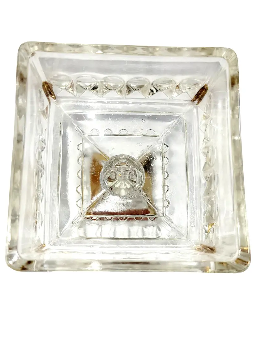 This vintage Jeannette Glass lidded pedestal dish showcases elegant craftsmanship with its intricate pressed glass design and luxurious gold trim accents. A timeless addition to any glassware collection, it exudes an antique charm ideal for storing trinkets or serving candies.