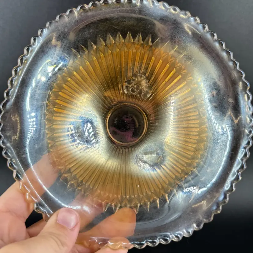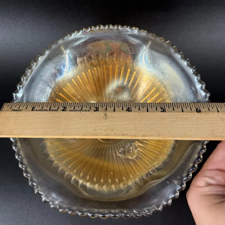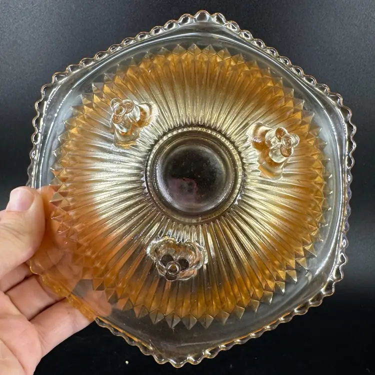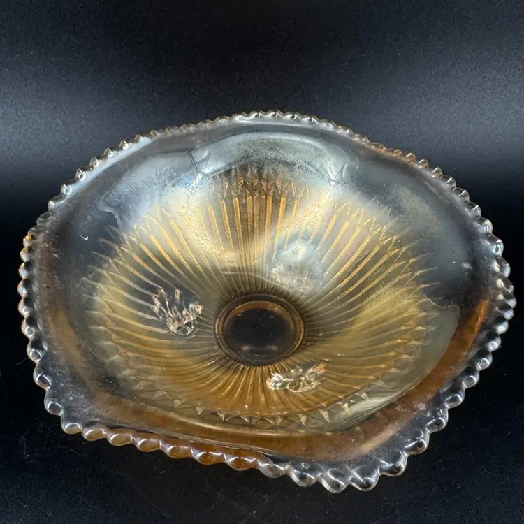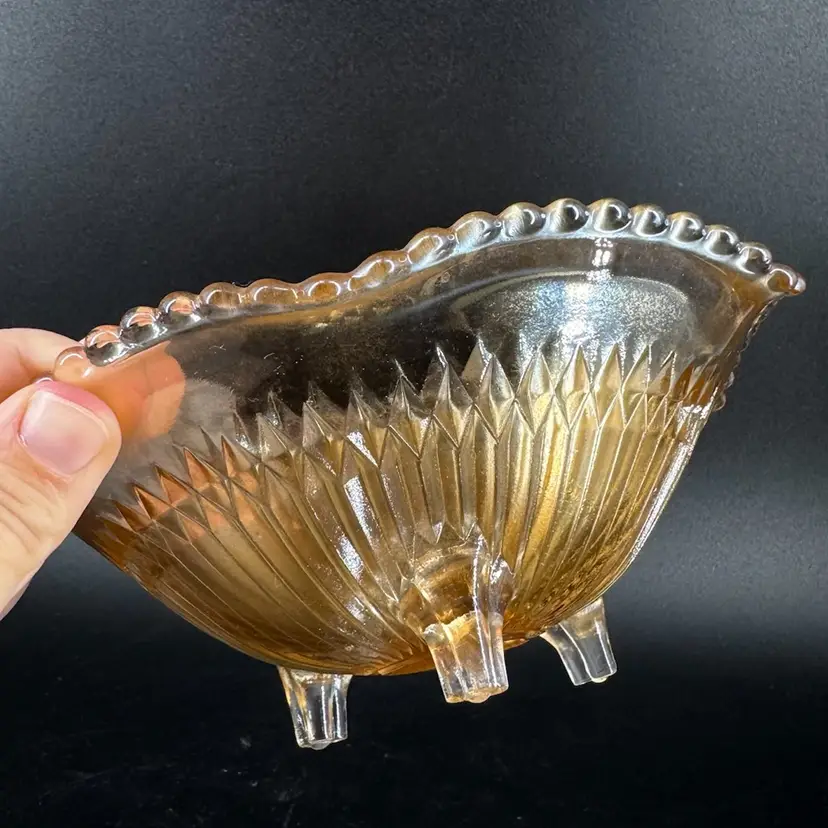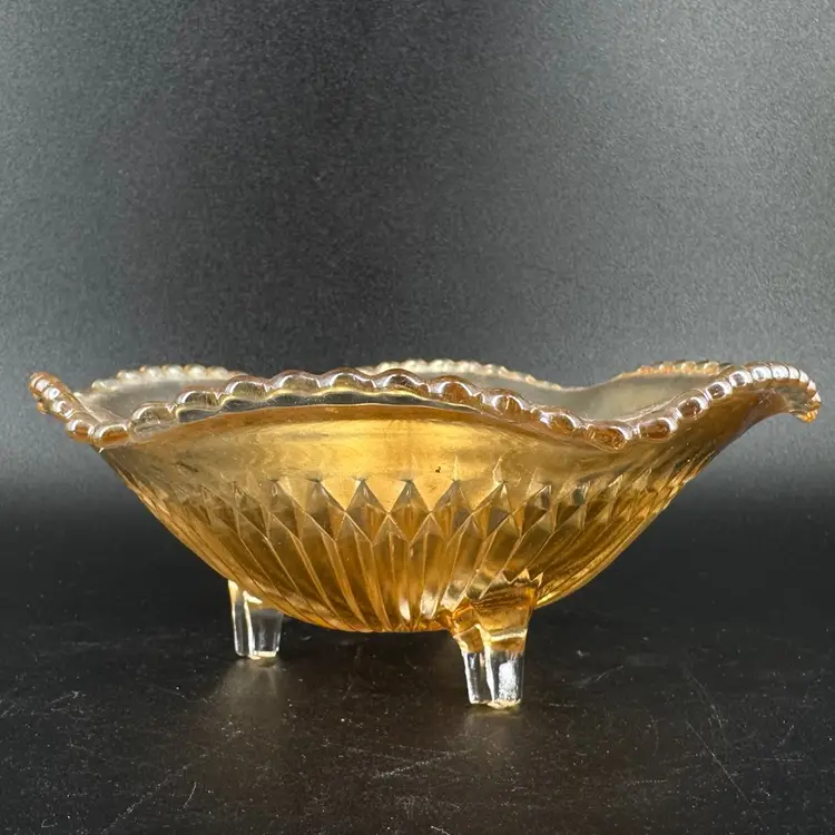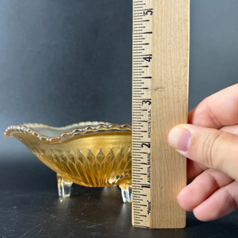 This Jeannette Marigold Anniversary Carnival Glass 3-Footed Dish height is approximately 2.5” and the width is approximately 6.5”. There are no chips or cracks. Also is not signed or marked as well