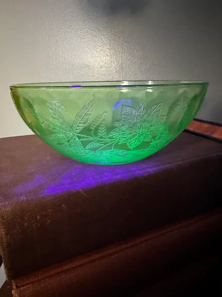 Measures approx 3 inches tall by 7.5 inches in diameter at widest point. Made in uranium green glass