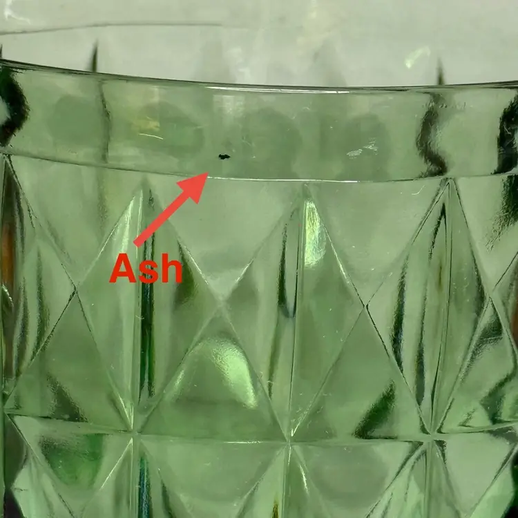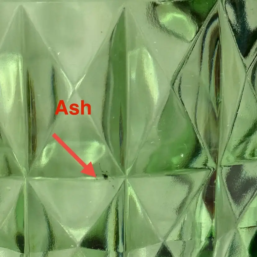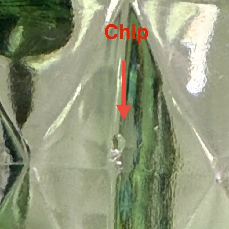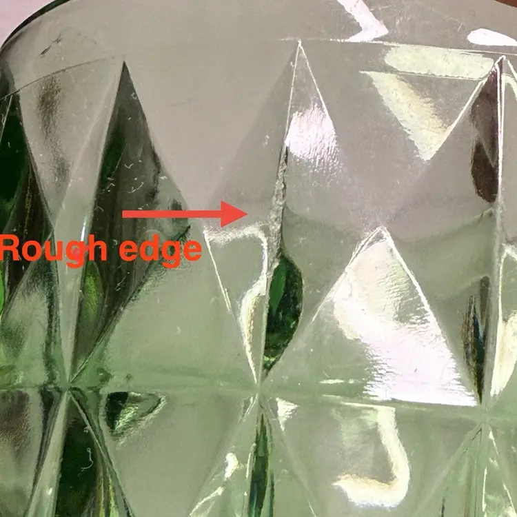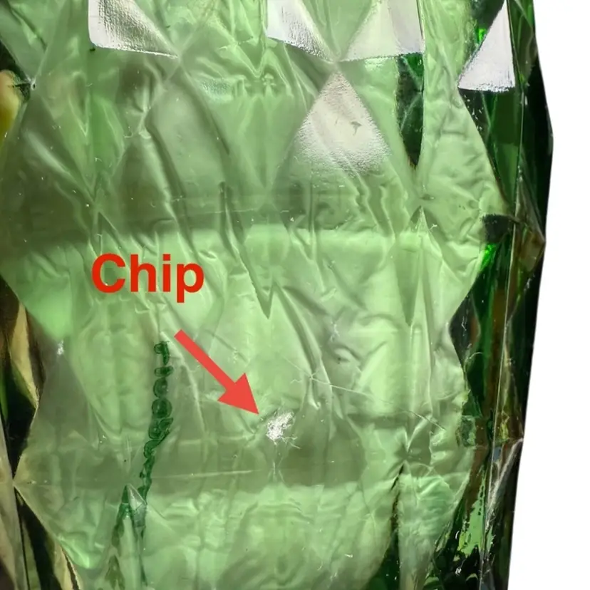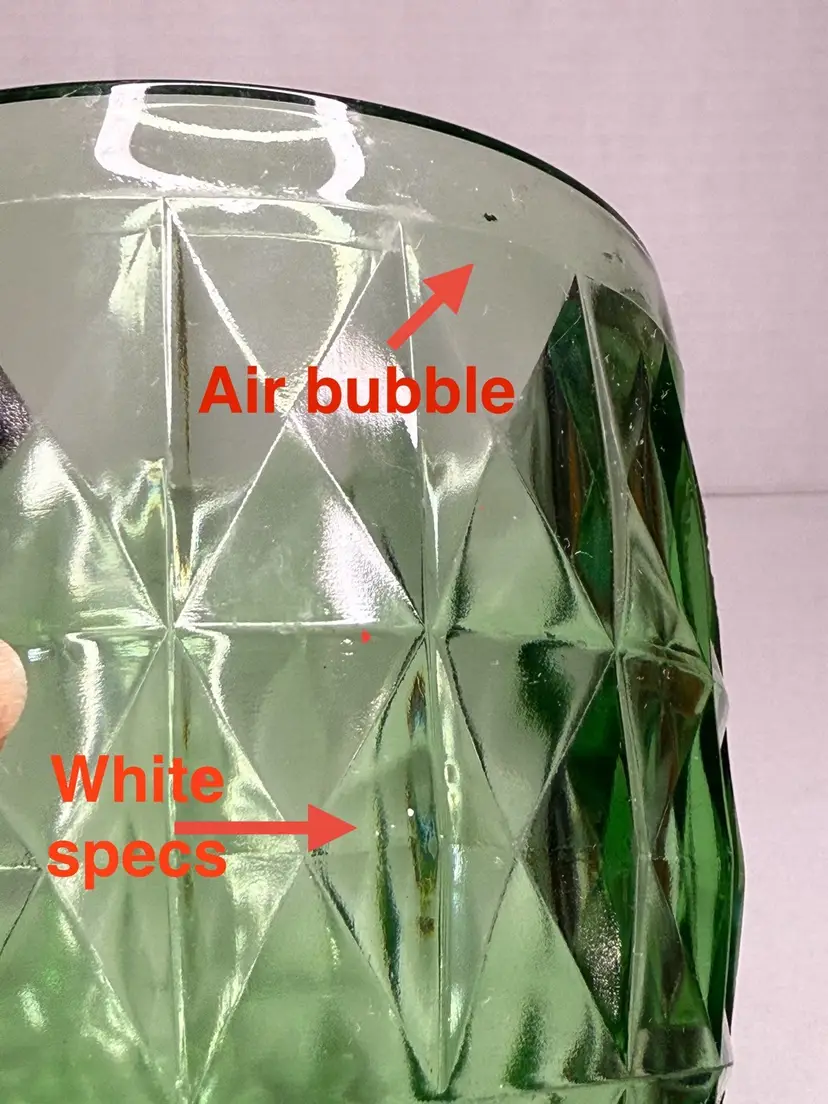 Condition: Some manufacturing imperfections such as ash specs, straw marks, tiny air bubbles. Two chips on the edges, and one edge of a square section is rough.