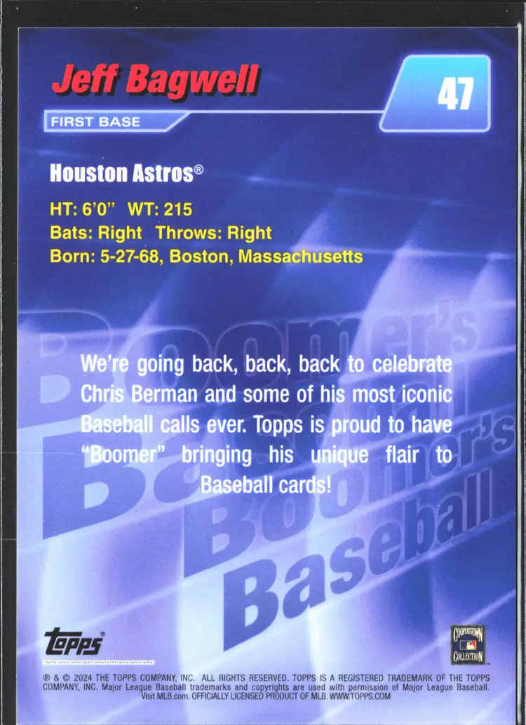 1st time buyer? Get $5 Off with code DISTRICT5 at checkout! Card as shown. All cards $20 and under ship PWE via lettertrackpro [https://www.letter-track.com/registerap.asp?AFID=8757] Sport: Baseball Manufacturer: Topps Type: Sports Trading Card Parallel/Variety: Gold Player/Athlete: Jeff Bagwell Autographed: No Signed By: Jeff Bagwell Year Manufactured: 2024 Vintage: No Graded: No Autograph Authentication: Topps Features: Parallel/Variety Team: Houston Astros Season: 2024 League: Major League (MLB) Material: Card Stock Original/Licensed Reprint: Original Country/Region of Manufacture: United States Set: 2024 Topps x Chris Berman Boomer's Baseball