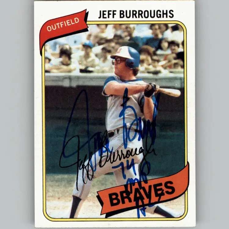 Classic baseball card featuring Jeff Burroughs in his Atlanta Braves gear, embellished with his own signature. A nostalgic piece for Braves supporters and autograph collectors. Your purchase aids Signatures For Soldiers in their vital work for homeless and disabled veterans.