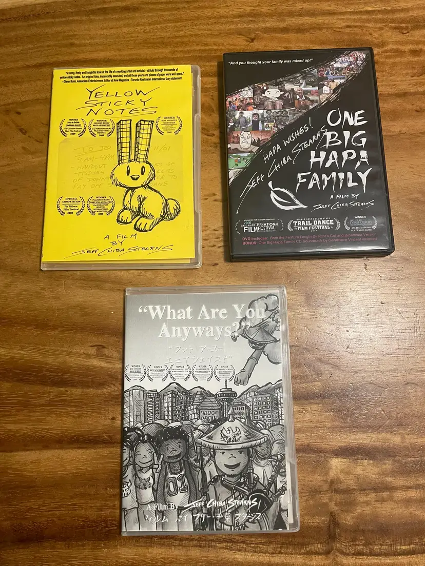 Jeff Chiba Stearns DVD Lot 3. All have some Light wear on case and dvd, but otherwise a higher grade copy, see pics. One Big Hapa Family 2 DVD Set Signed by Jeff. Yellow Sticky Notes What Are You Anyways