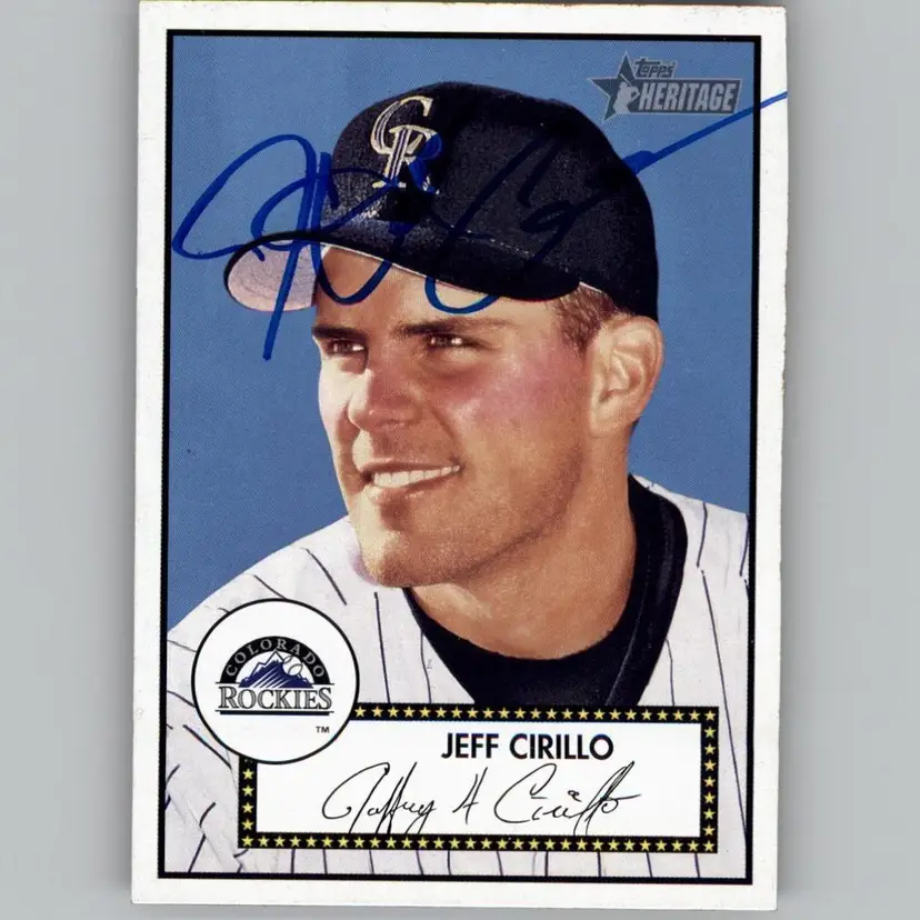 Authentic Topps Heritage baseball card featuring Jeff Cirillo of the Colorado Rockies, signed in blue ink. A great addition for Rockies fans and autograph collectors. Your purchase supports Signatures For Soldiers in helping homeless and disabled veterans.