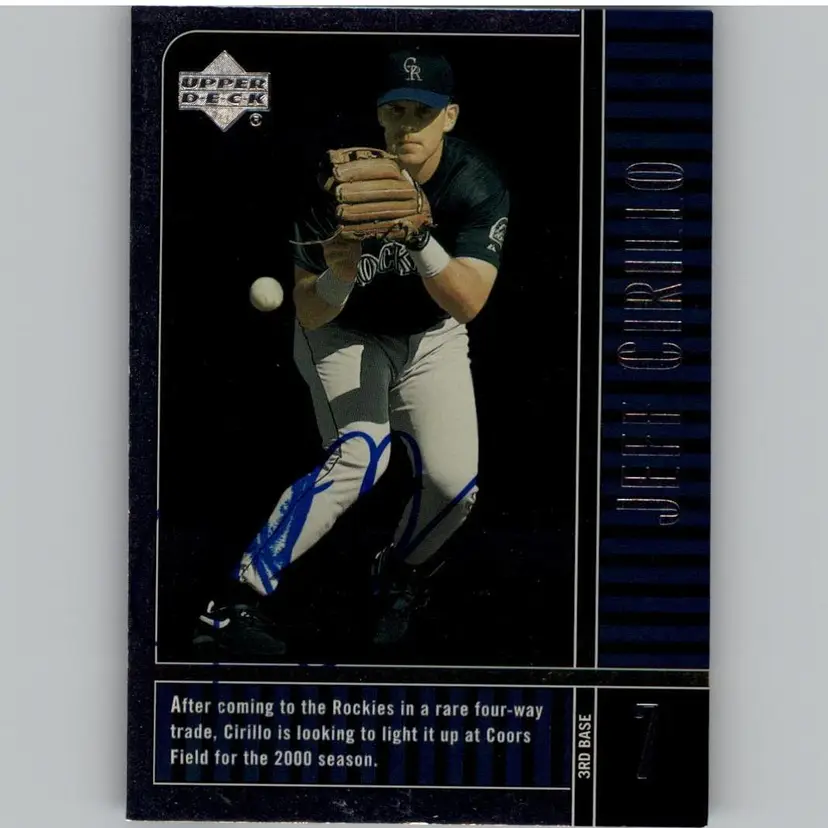 Authentic Upper Deck baseball card featuring Jeff Cirillo of the Colorado Rockies, signed in blue ink. A great addition for Rockies fans and autograph card collectors. Your purchase supports Signatures For Soldiers in helping homeless and disabled veterans.