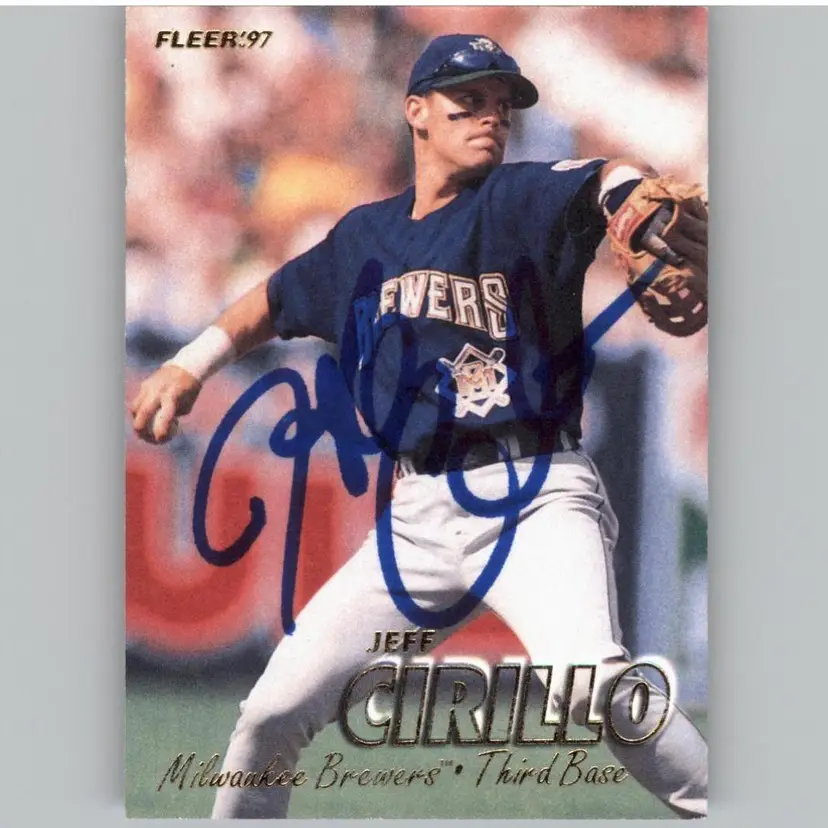 Authentic 1997 Fleer baseball card featuring Jeff Cirillo of the Milwaukee Brewers, adorned with his signature in blue ink. A prized collectible for Brewers fans and autograph card enthusiasts. Your purchase supports Signatures For Soldiers in helping homeless and disabled veterans.