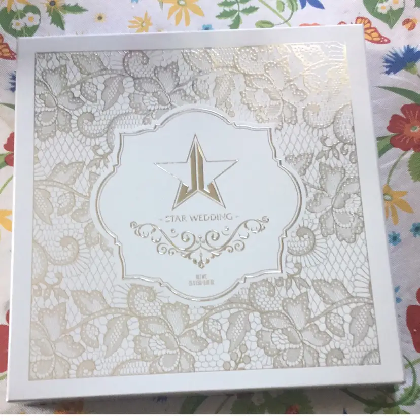 SOLD OUT AND HARD TO FIND!! This is a 25-pan eyeshadow palette featuring a range of neutral shades suitable for weddings or special occasions. The palette's packaging is white with a lace-like design and gold accents, including the Jeffree Star logo and the name "Star Wedding". The palette contains a variety of shades, including: Matte shades: A pale peach nude ("Grand Entrance"), a pale amber ("Seating Chart"), and a pale brown ("Hors D'oeuvres"). Metallic shades: A silver with gold shimmer ("Cut The Cake"), a light champagne with champagne and silver pearls ("Star Vows"), and a golden brown with champagne and silver pearl ("Wedding Rings"). Other shades: A light peachy brown ("Save The Date") and a gold with gold shimmer ("Gold Blooded"