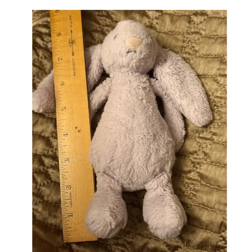 Jellycat Bashful Bunny stuffed animal. Known for being incredibly soft and huggable, it is a popular plush toy for all ages. The specific color appears to be a shade of purple or lilac, potentially the "Viola" It features long, floppy ears and a sweet expression. The toy is constructed with premium-grade, durable materials.