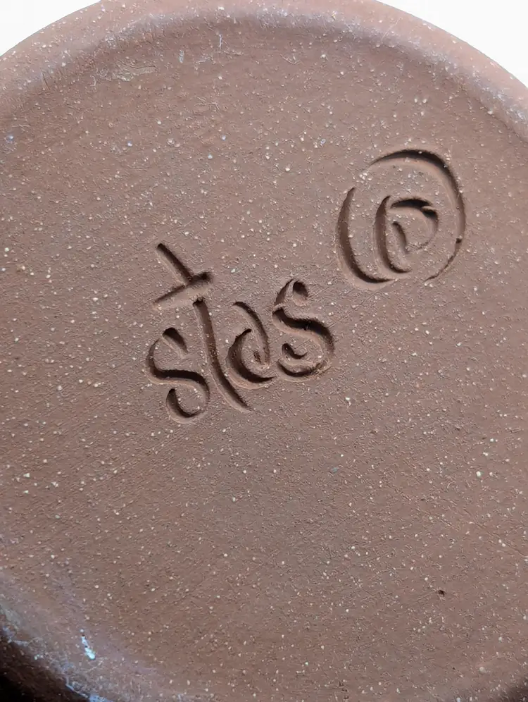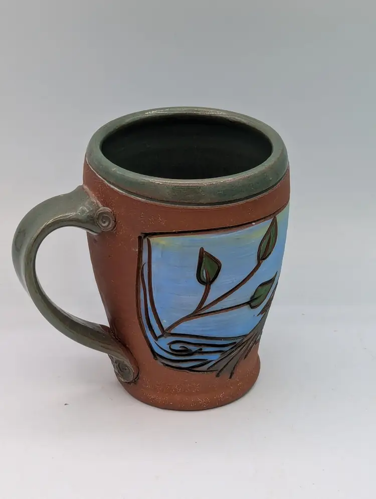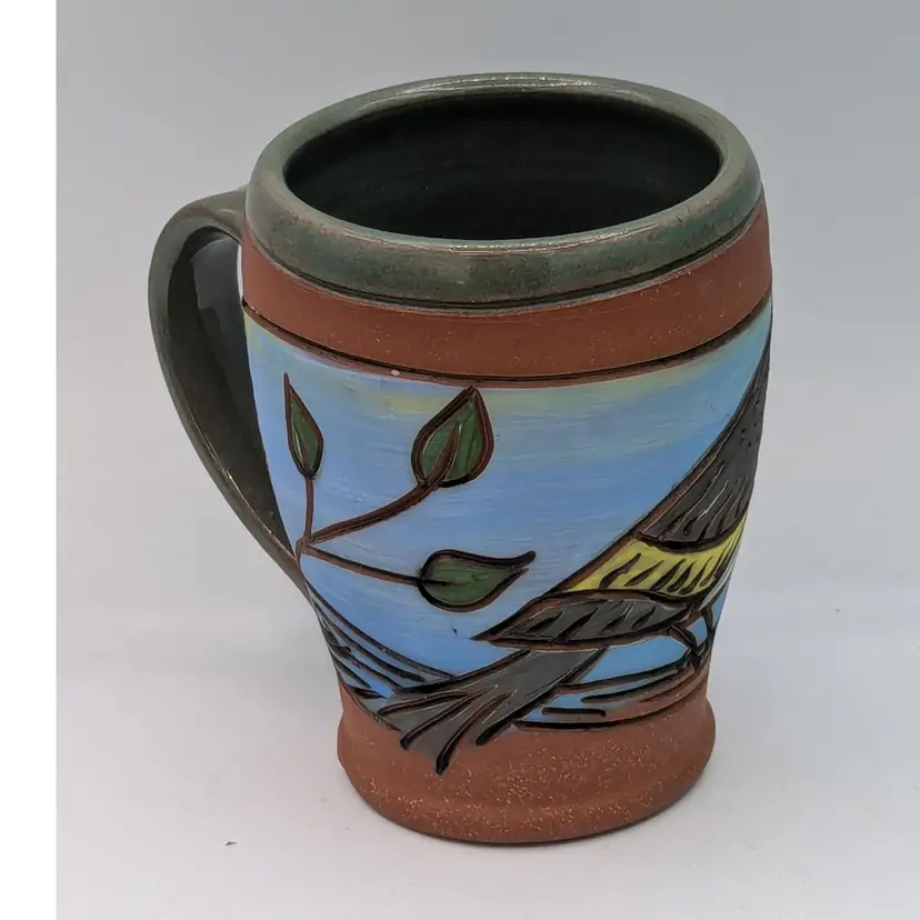 This stunning mug is created by carving the image into the clay; this is called sgraffito. The mug is slab built with a folded seam down the back, satin under glaze, and a shiny glazed bird. The background highlights the bird with green accenting the rim and the lining of the mug.