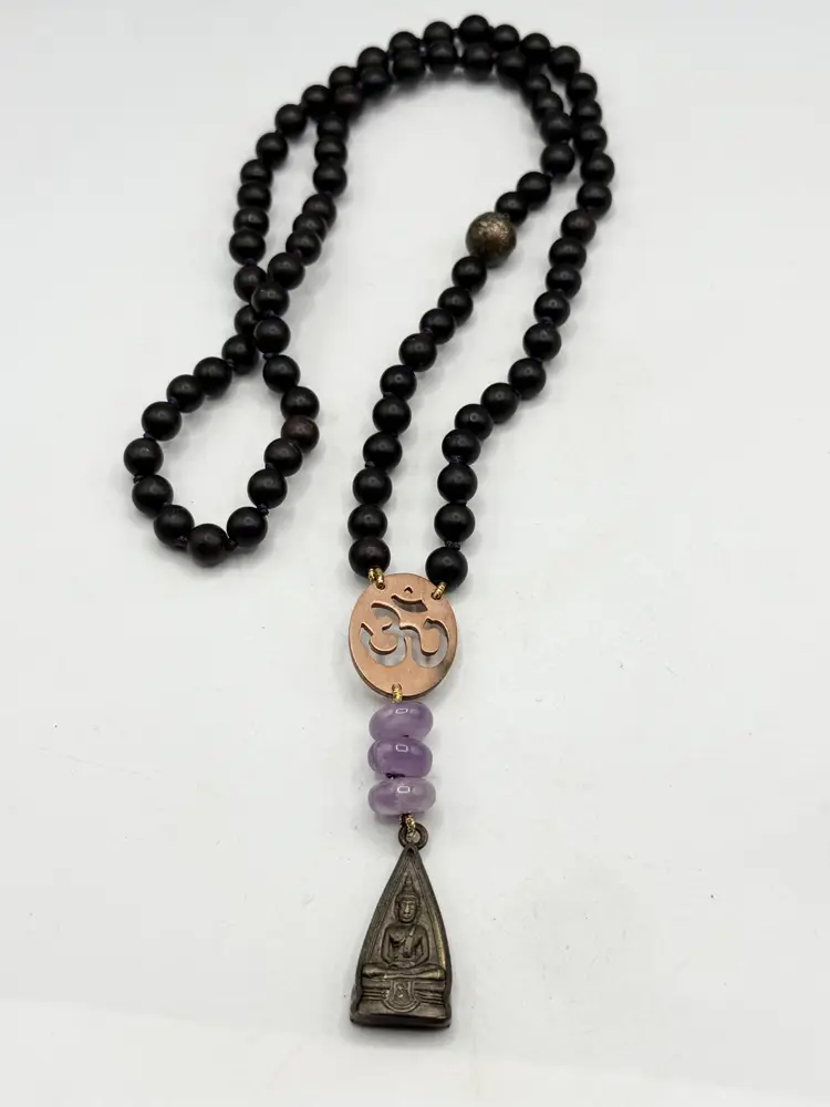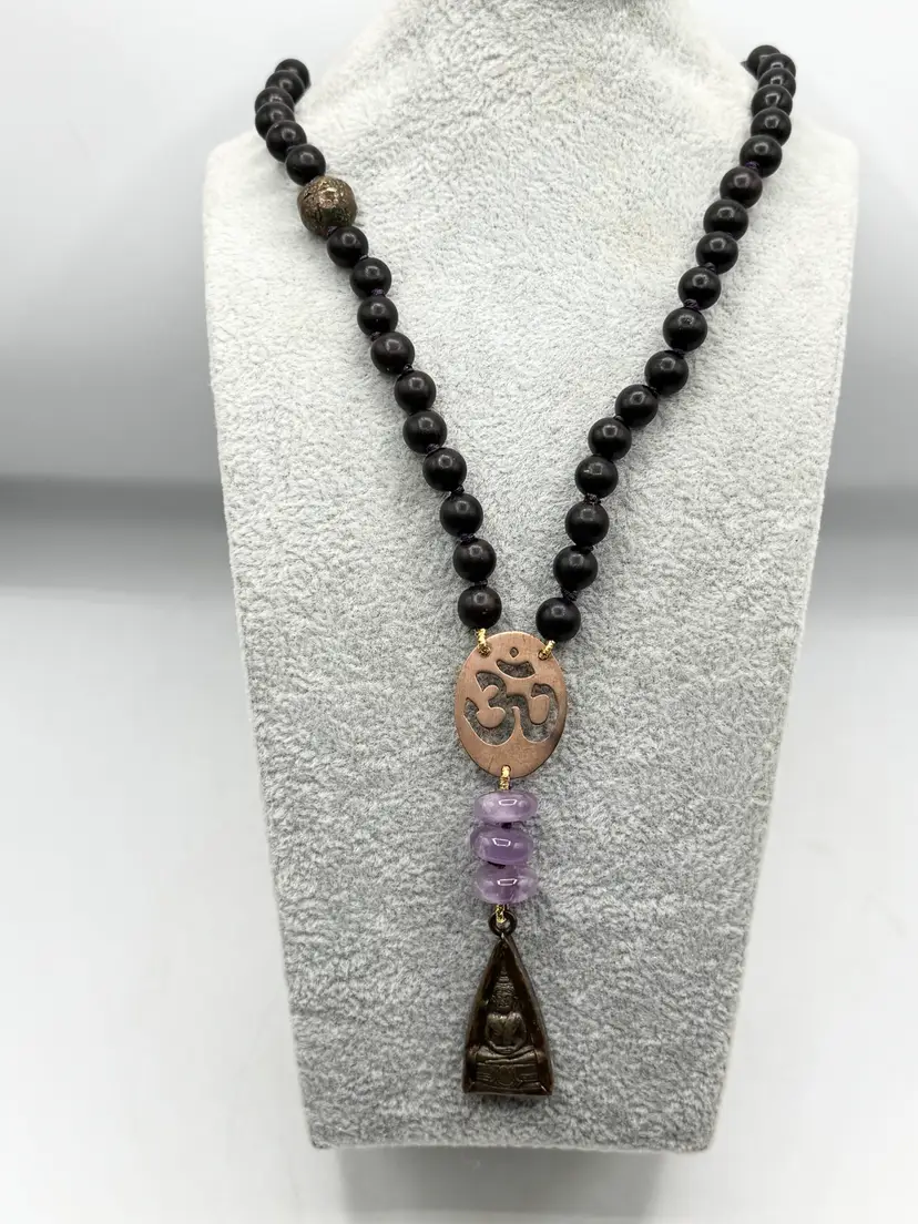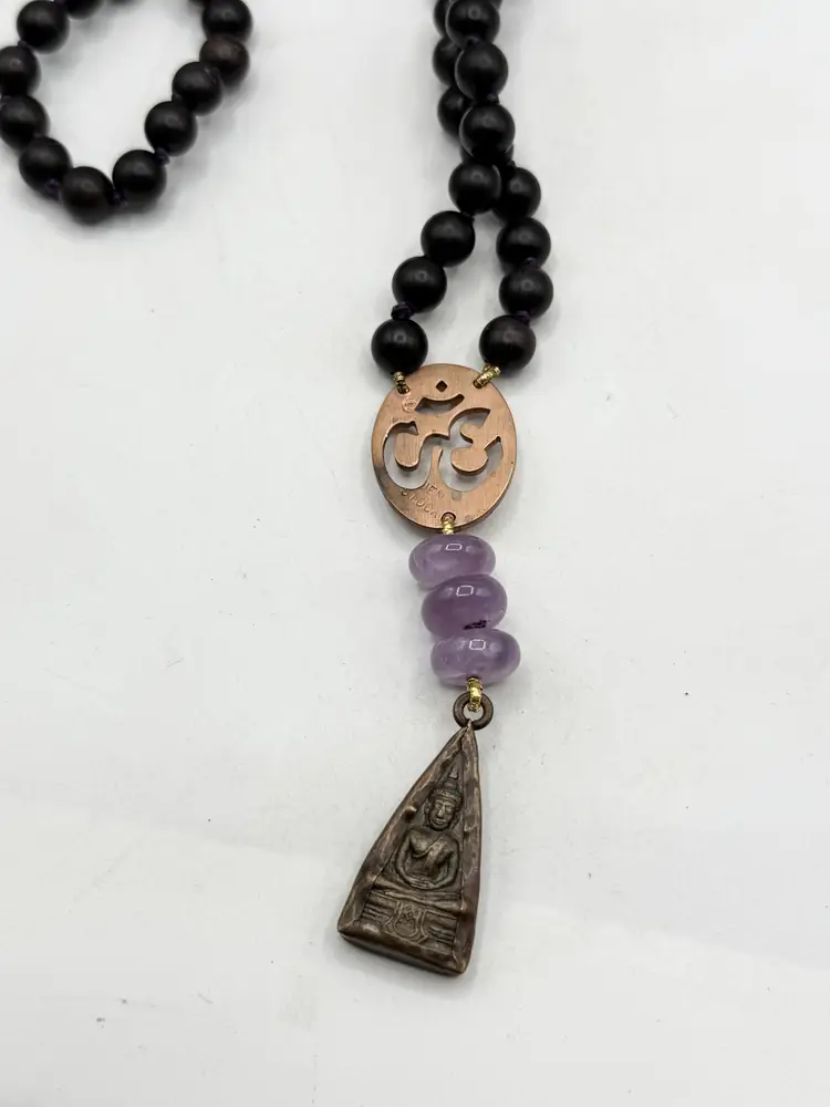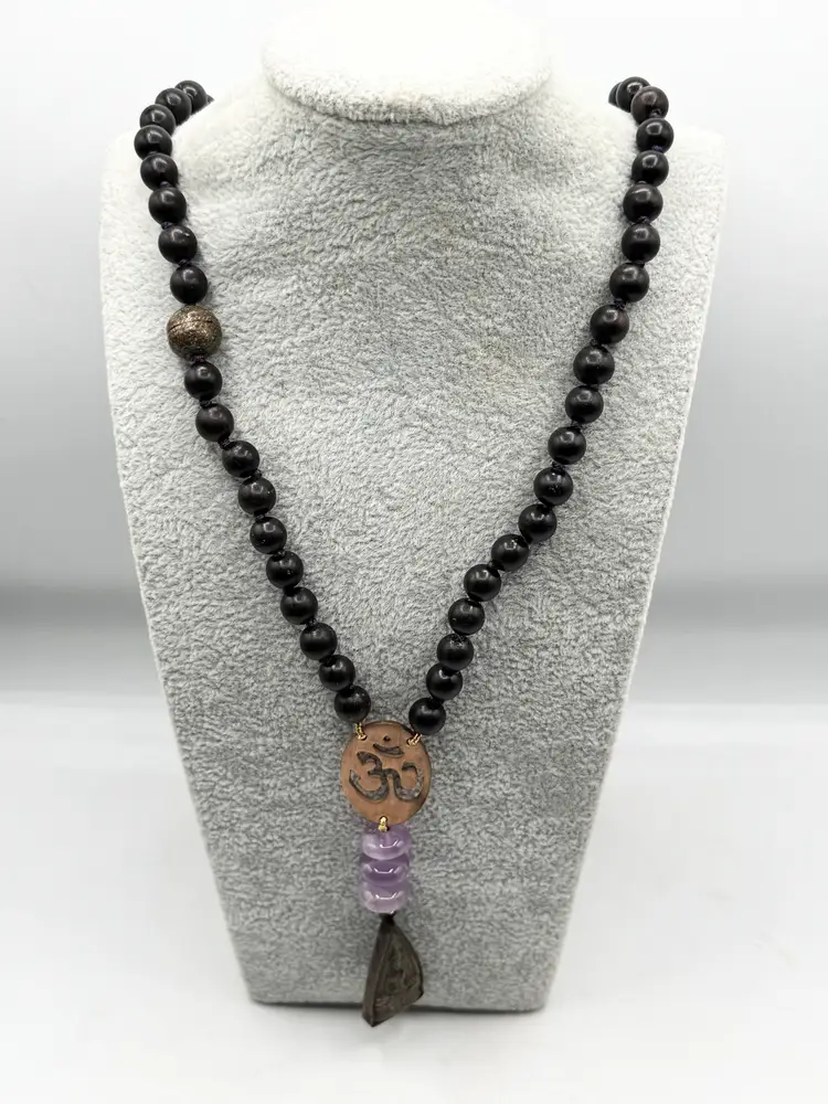 Jen Stock long beaded stone pendant Buddha necklace. Marked Jen Stock. Black beads hand knotted with purple thread. Tribal Buddha pendant and beads. Purple stone beads Vintage necklace. MN54NM.